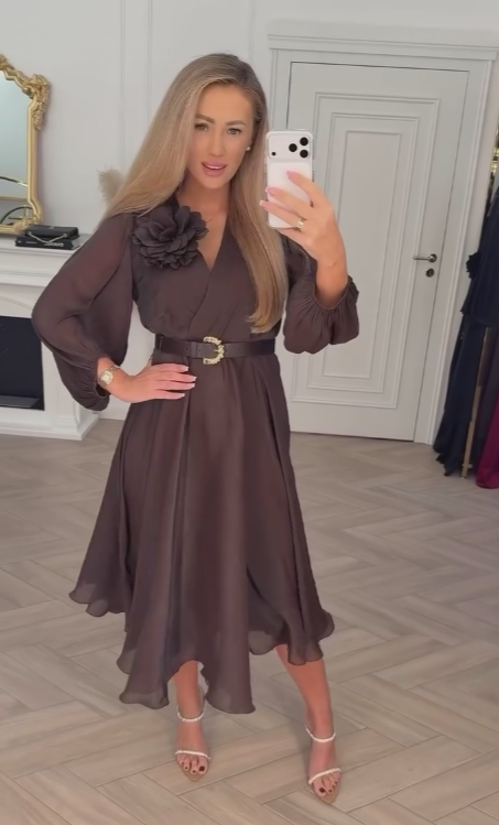Sukienka midi z dekoltem w serek, zdobiona trójwymiarowymi kwiatami, z paskiem i długimi rękawami.145,00 zł PLN405,00 zł PLNDescribe your product