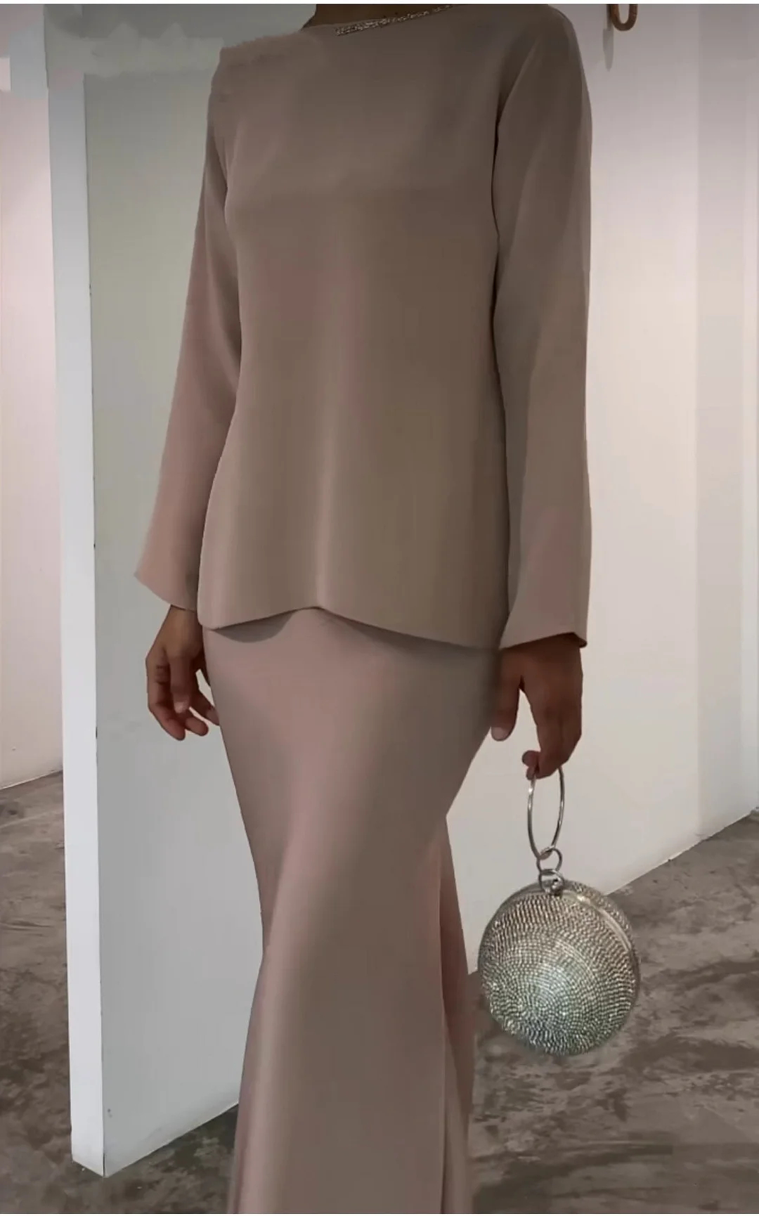 Góra ma okrągły dekolt z rękawami typu nietoperz i głębokimi otworami na ręce do talii. Jest luźna i ma duży drapowany kształt. Długość jest krótka i jest to luźna bluzka. Dół to spódnica w stylu rybiego ogona. Spódnica dopasowuje się do linii nóg i stopniowo rozszerza się od kolan, tworząc kształt rybiego ogona, który może zarysować linię nóg noszącej ją osoby i pokazać elegancką postawę. Ogólny styl jest prosty i hojny, z zarówno wyczuciem mody, jak i eleganckim temperamentem. 3 artykuły