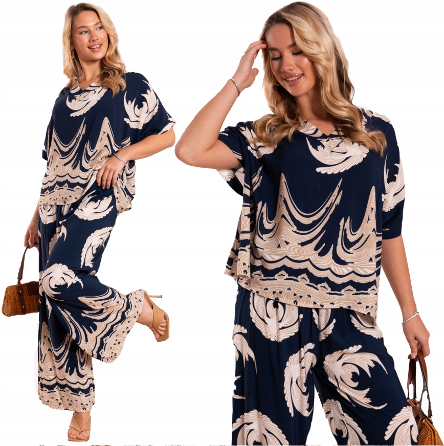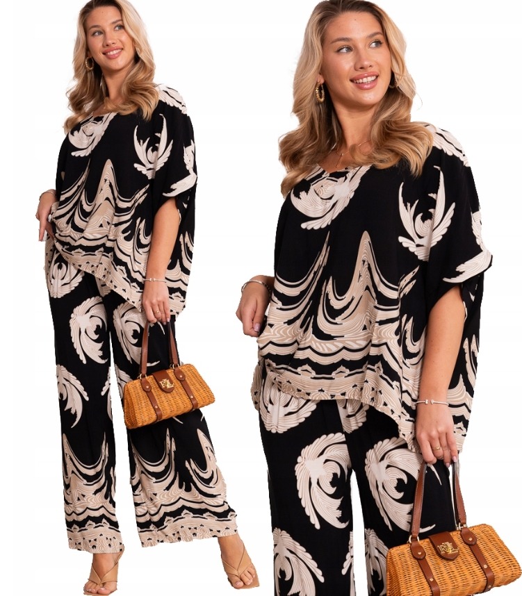 Góra ma okrągły dekolt, krótkie rękawy i luźny krój, pokazując swobodny i zrelaksowany styl. Korpus góry pokryty jest dużymi wzorami kwiatowymi, z ostrymi kontrastującymi kolorami, dodającymi wizualnych akcentów. Dół to szerokie spodnie, które są luźne i dobrze się układają. Są również nadrukowane wzorami kwiatowymi, które nawiązują do góry, a po obu stronach znajdują się kieszenie, które są zarówno praktyczne, jak i piękne. Cały garnitur nadaje się na wakacje, codzienny wypoczynek i inne okazje, a także łatwo jest stworzyć modny i wygodny wygląd.