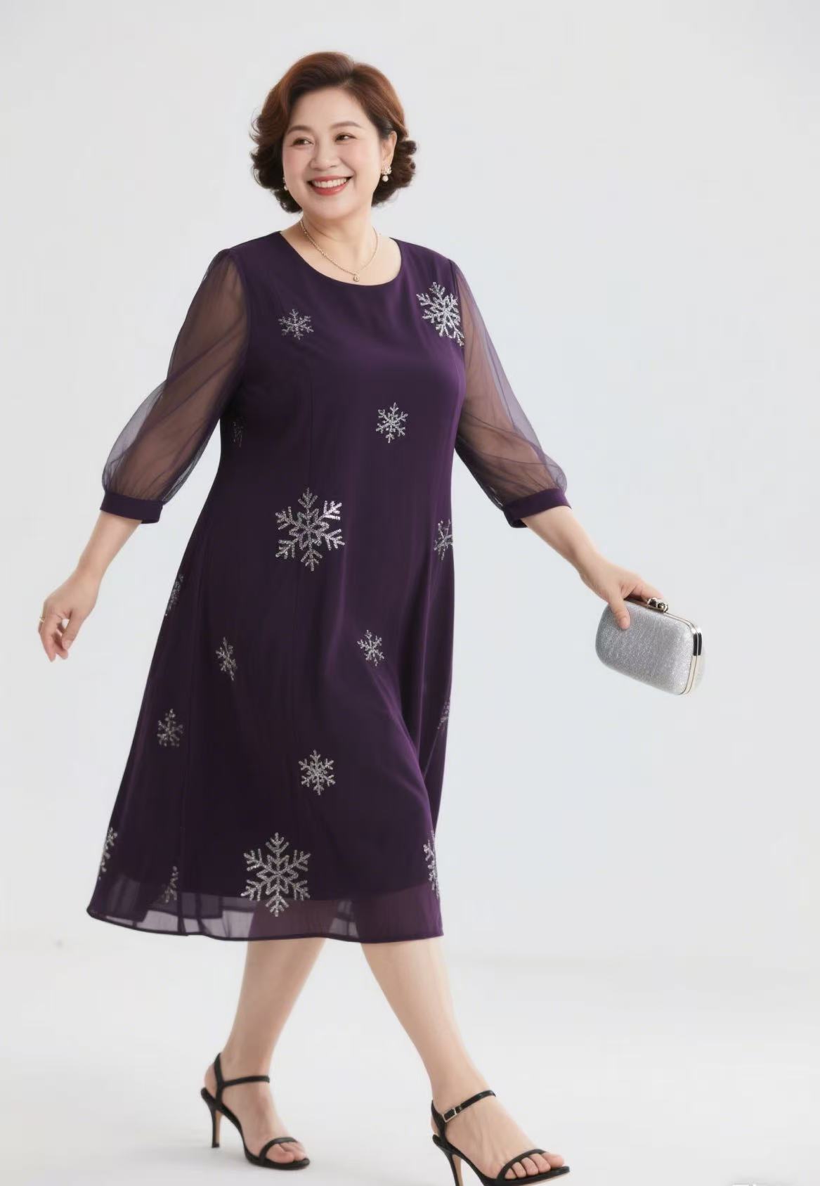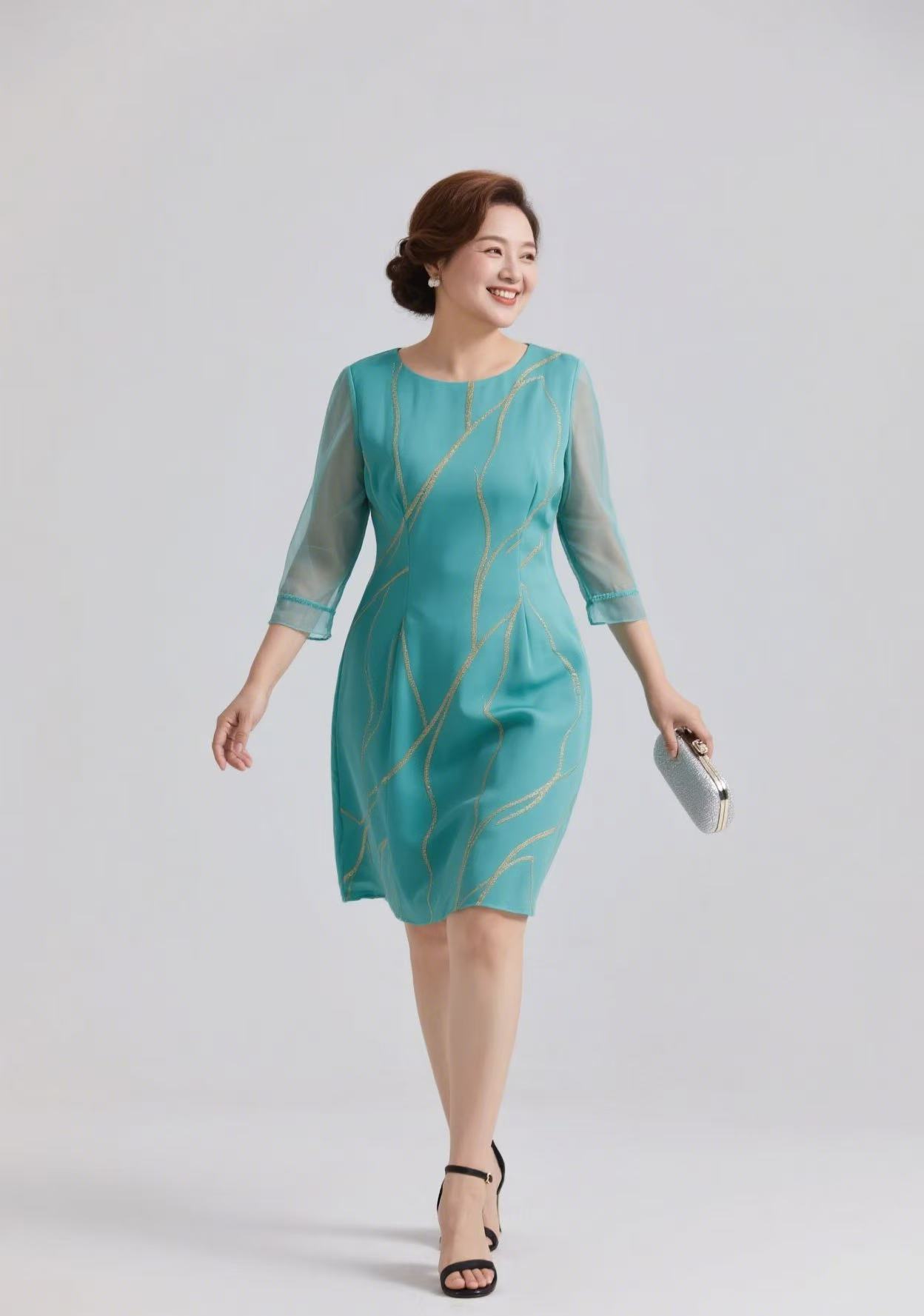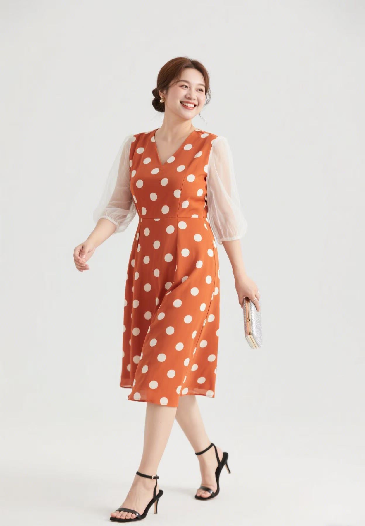 Ta sukienka jest dla kobiet o większych rozmiarach. Ma okrągły dekolt, który jest prosty i elegancki. Rękawy trzy czwarte są wykonane z organzy, która jest przezroczysta i ma delikatne nadruki, dzięki czemu jest lekka i warstwowa. Główna część sukienki jest również pokryta kwiatowymi nadrukami, a cały styl jest elegancki i romantyczny. Wersja średniej długości modyfikuje kształt ciała i nadaje się na różne okazje, takie jak codzienne wyjścia, lekkie spotkania towarzyskie itp.