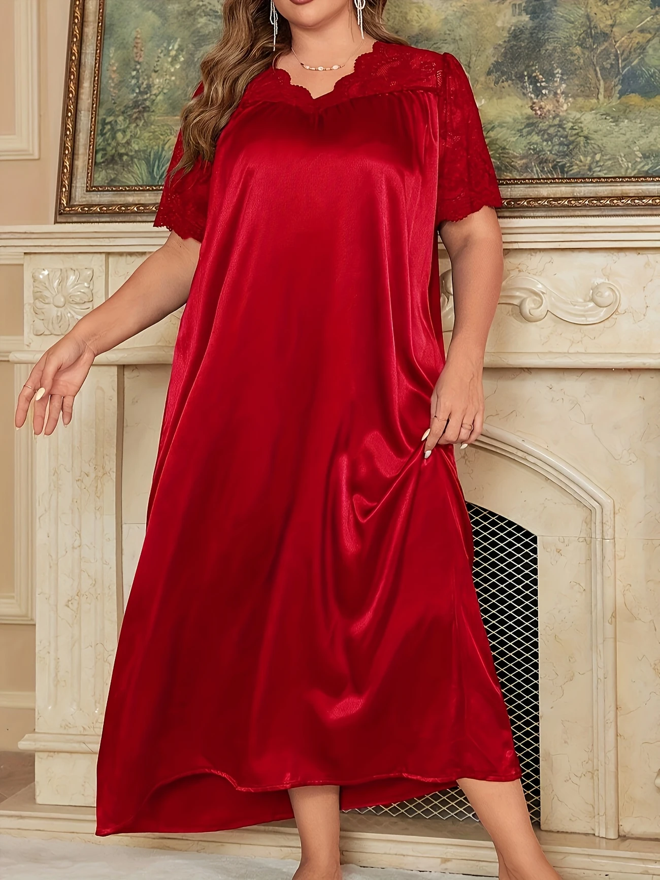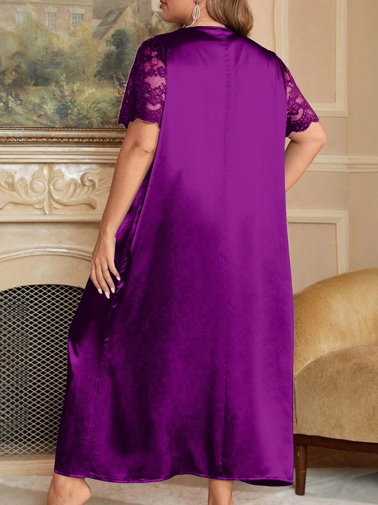 Styl to damska koszula nocna. Klasyczny krój dekoltu w serek dodaje elegancji. Krótkie rękawy są wykonane z materiału koronkowego, a delikatny wzór koronki jest dopasowany do koronkowej dekoracji, pokazując miękkość i romantyzm; główna część jest wykonana z gładkiego materiału satynowego, o wysokiej jakości fakturze i dobrym drapowaniu. Całkowita wersja jest luźna i wygodna w noszeniu, odpowiednia do spania w domu lub relaksu.
