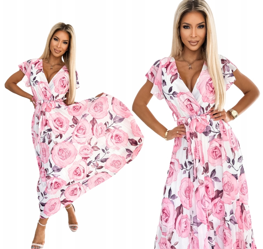 Projekt dekoltu w serek może modyfikować linię szyi i dodawać seksownego uroku. Krótkie rękawy to latające rękawy, które są inteligentne i zabawne. Talia jest wyposażona w pasek w tym samym kolorze, który można zawiązać w kokardę, aby podkreślić linię talii i pokazać proporcje ciała. Spódnica jest pokryta różowymi i białymi wzorami kwiatowymi z zielonymi elementami liści, tworząc romantyczną i słodką atmosferę. Spódnica dobrze się układa i ma długość do kostek. Ogólny projekt nadaje się na randki, wakacje, lekkie spotkania towarzyskie i inne okazje.