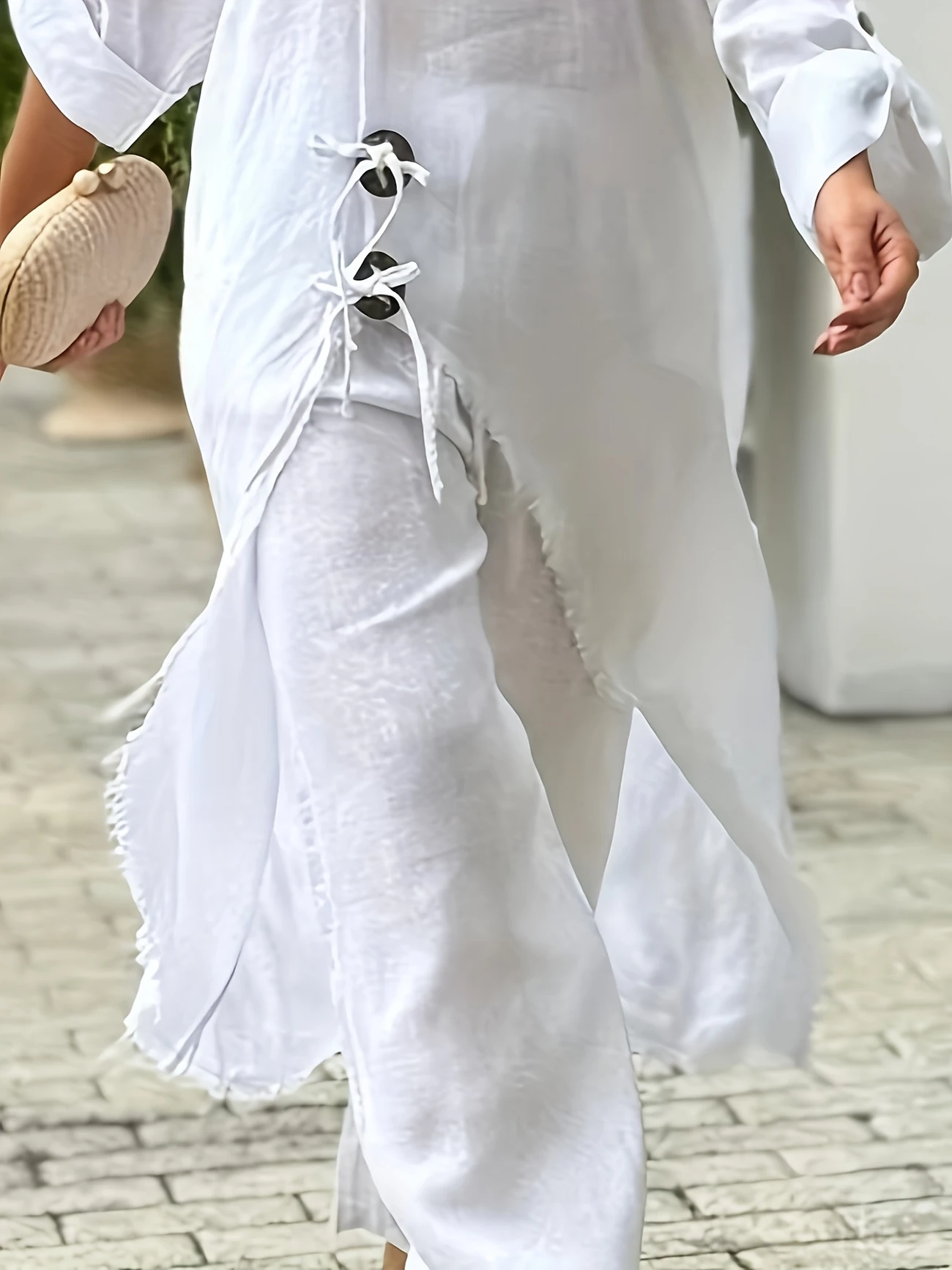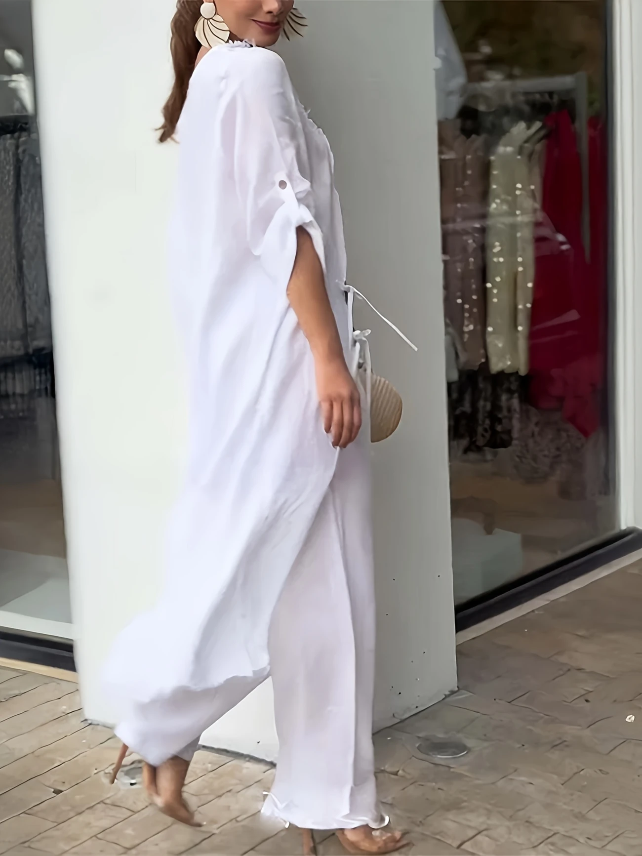 Sukienka ma asymetryczny design, z jedną stroną odsłaniającą ramiona, co pokazuje wyjątkowy styl. Rękawy są luźne, długie, a niektóre mankiety są podwinięte. Materiał korpusu jest cienki i lekki, z naturalnym plisowanym wykończeniem. Po lewej stronie znajdują się guziki i sznurowadła, które dodają warstwę detali. Dół ma nieregularny surowy brzeg. Ogólny styl jest swobodny i nieformalny z silnym poczuciem designu. Nadaje się na wypoczynek, wakacje i inne okazje.
