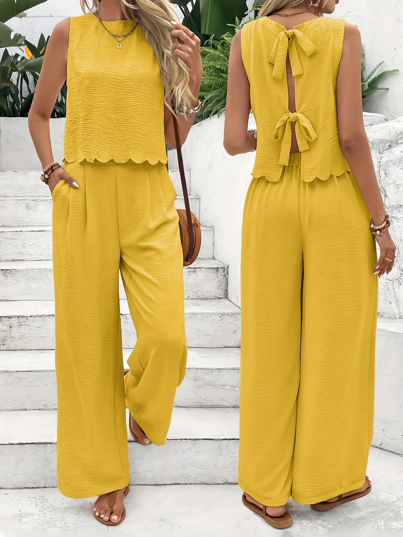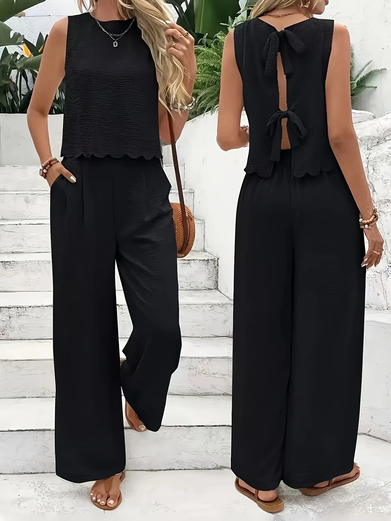 Styl to kombinezon. Góra jest bez rękawów z okrągłym dekoltem, teksturowanym korpusem i falistym dołem, dodając wyrafinowania. Tył ma wzór z koronką krzyżową, który można regulować i który może również pokazać wyjątkowy styl. Dół to wersja spodni z szerokimi nogawkami, luźna i drapowana, ogólny styl jest swobodny i wygodny, odpowiedni na wakacje, codzienny wypoczynek i inne okazje.