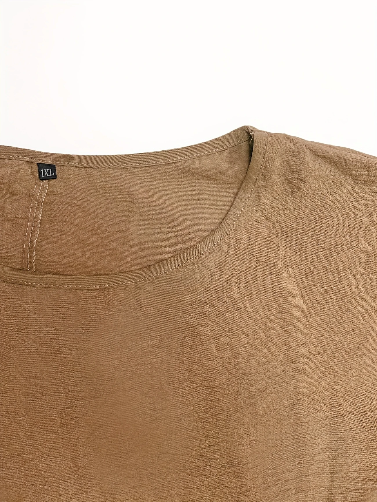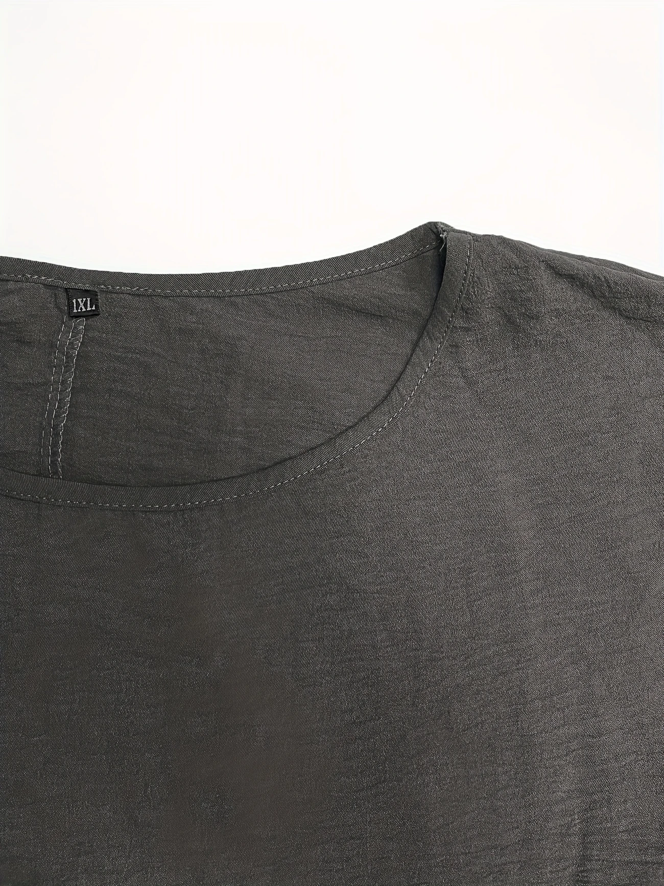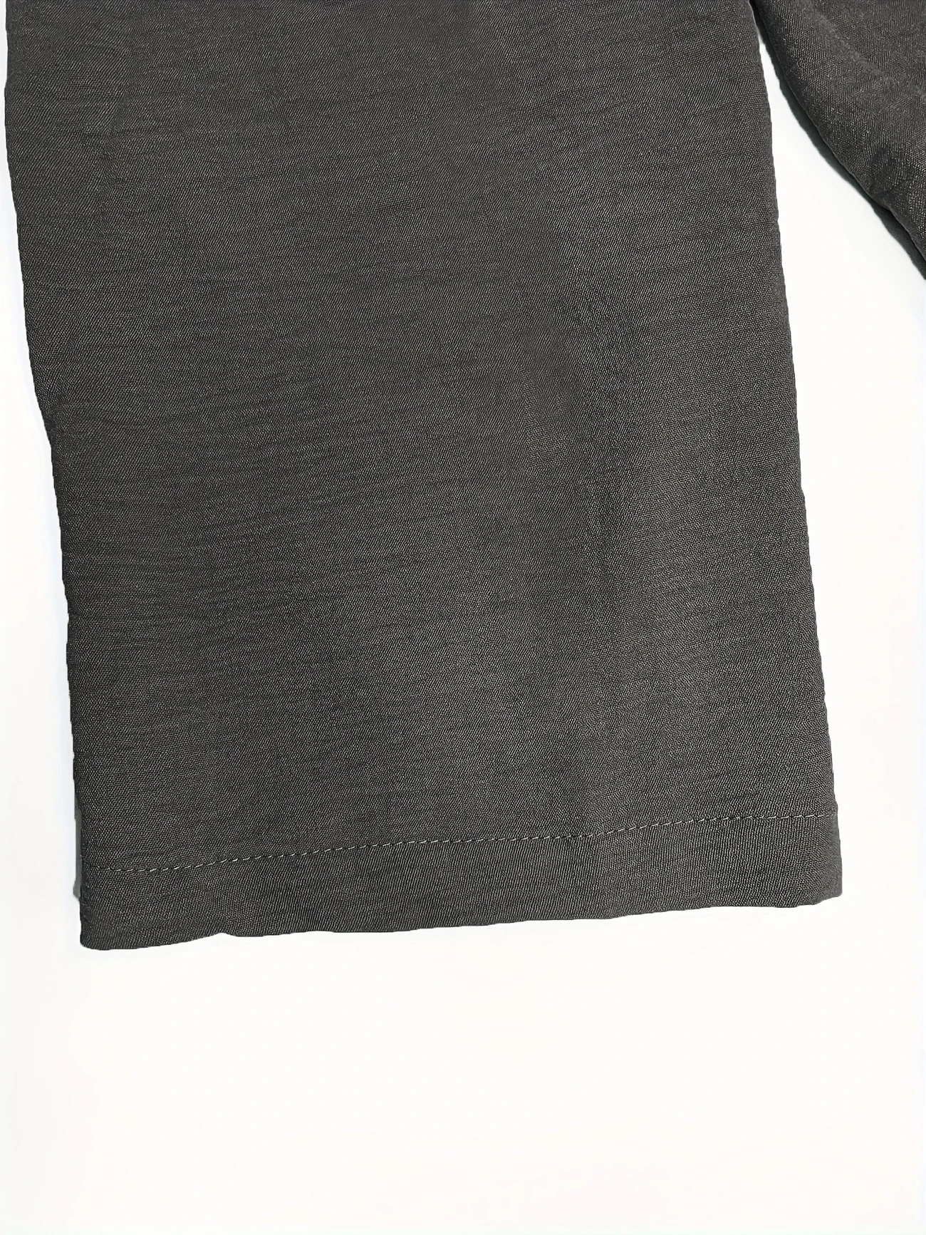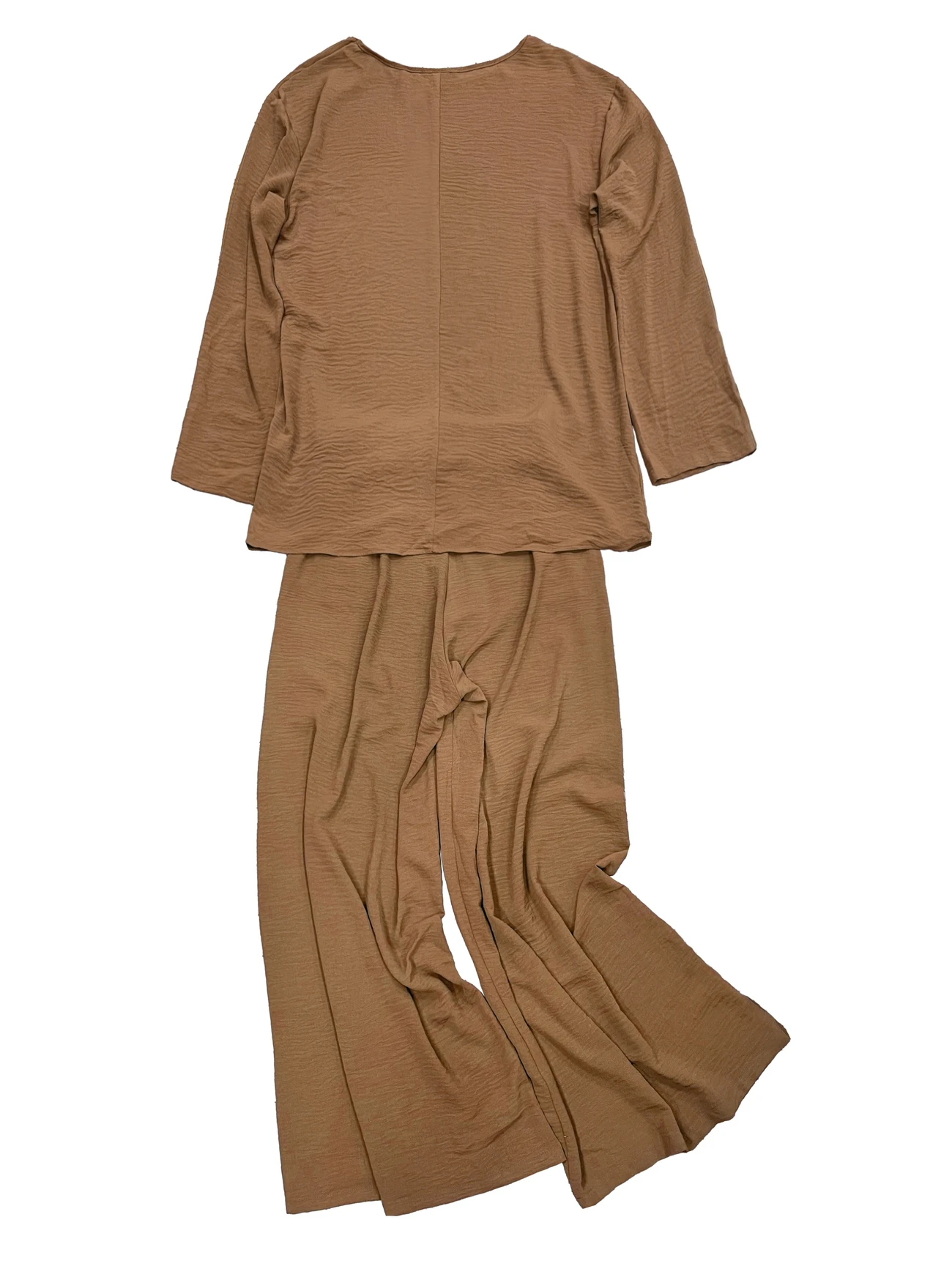 Ubranie to swobodny garnitur. Góra to okrągły dekolt o luźnym kroju. Rękawy są średniej długości i można je podwinąć, dodając luzu. Dół to szerokie spodnie, które są również luźne i dobrze się układają. Materiał ubrania ma wyjątkową fakturę, a styl jest prosty i obszerny, ma tendencję do bycia swobodnym i wygodnym. Nadaje się na codzienne podróże, zakupy i inne okazje.