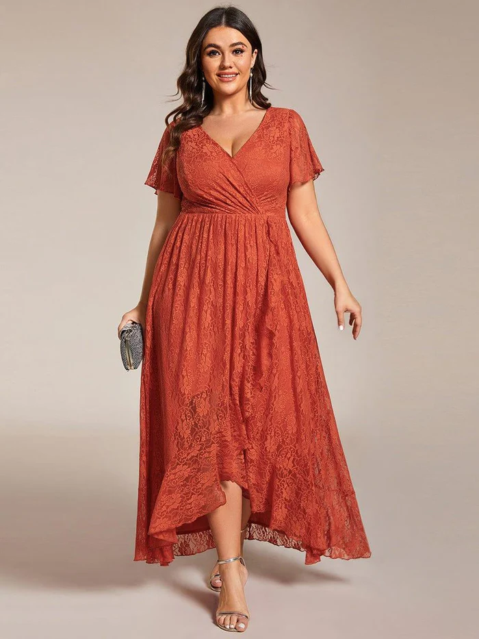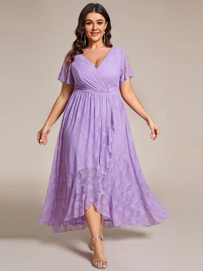 Ta sukienka ma dekolt w serek, pokazując elegancki styl krzyża, modyfikując linię szyi. Krótkie rękawy są wykonane z materiału koronkowego, który jest delikatny i wykwintny. Talia jest wcięta, aby podkreślić krzywiznę ciała. Spódnica jest szeroka, a całość wykonana jest z materiału koronkowego, pokazując romantyczną fakturę. Nieregularny krój spódnicy z krótkim przodem i długim tyłem dodaje poczucia mody i zwinności.