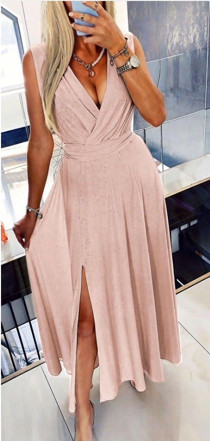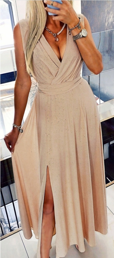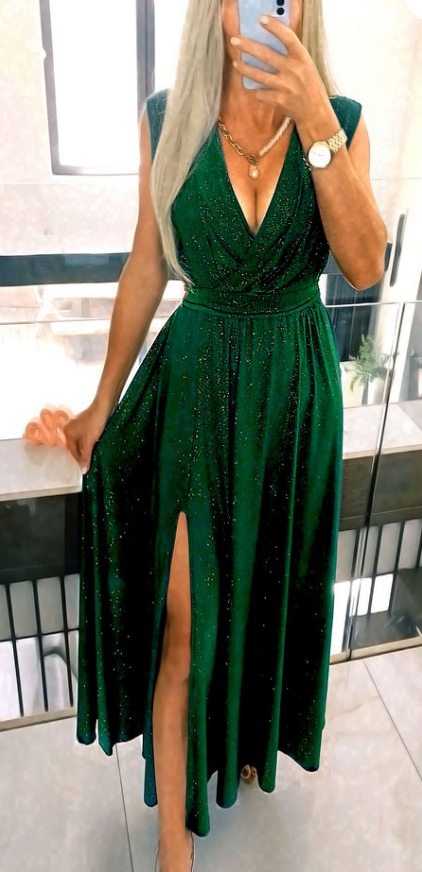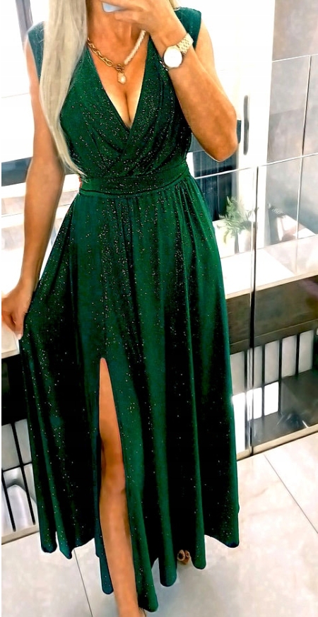 Bezrękawnikowy krój odsłania linie ramion. Głęboki dekolt w serek dodaje seksownego temperamentu. Talia jest wcięta, aby podkreślić krzywiznę ciała. Spódnica jest pokryta błyszczącymi ozdobami, co dodaje jej luksusu. Wysokie rozcięcie u dołu odsłania linie nóg podczas chodzenia, co jest eleganckie i przyciąga wzrok. Ogólny styl nadaje się na formalne okazje, takie jak imprezy i kolacje.