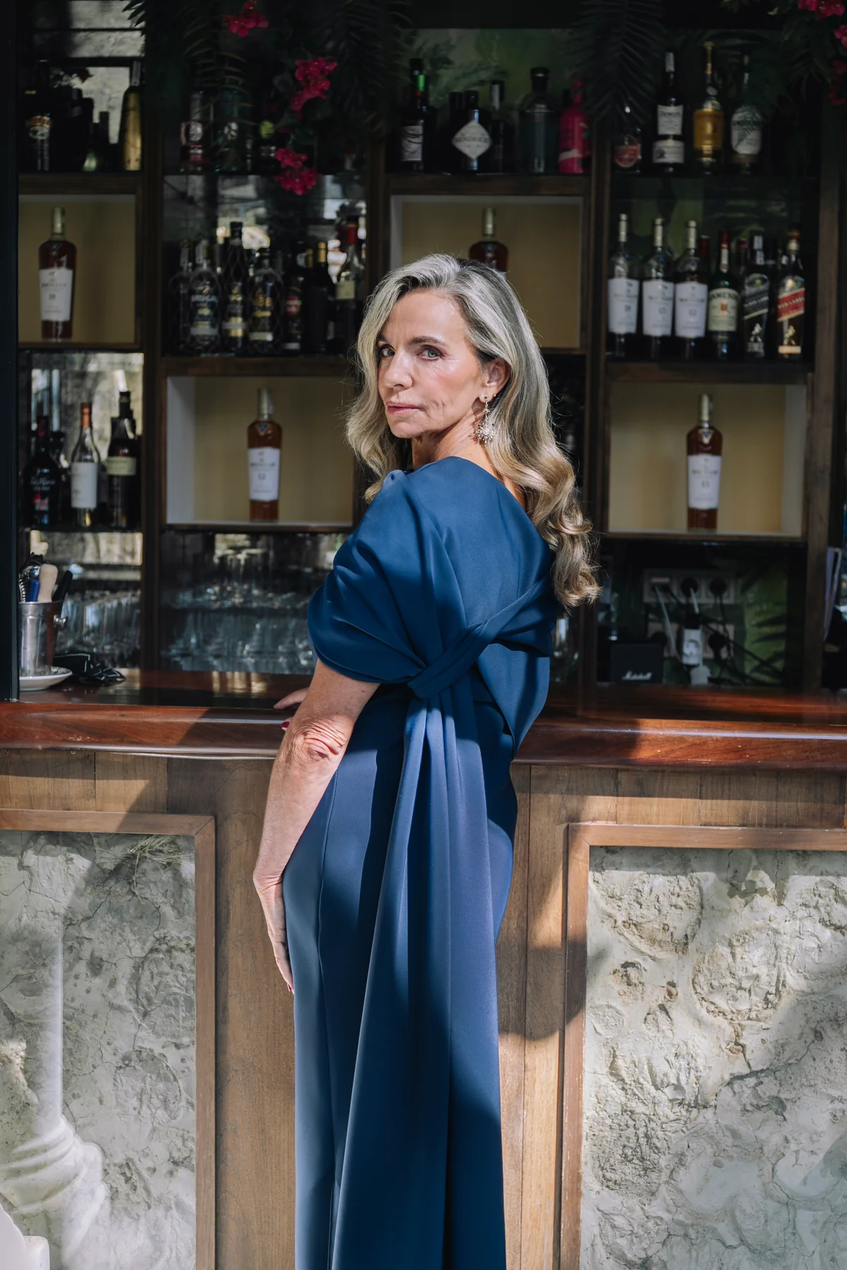 Asymetryczny krój z jednym odsłoniętym ramieniem pokazuje wyjątkowe wyczucie mody, a granatowy odcień dodaje elegancji. Dopasowany krój podkreśla kształt ciała, rozcięcia na spódnicy zwiększają elastyczność, a drapowana tkanina dopasowuje się do skóry, ukazując wysokiej jakości fakturę. Nadaje się na formalne okazje, takie jak kolacje i przyjęcia, i może łatwo stworzyć wizerunek bogini z temperamentem.