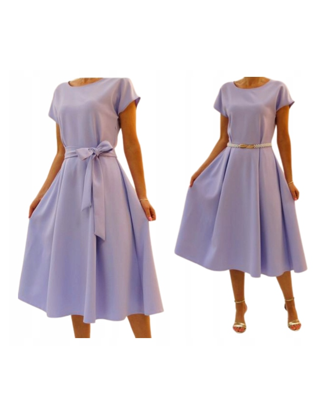 Sukienka z krótkim rękawem i okrągłym dekoltem ma szeroki rozkloszowany styl spódnicy parasolowej i wbudowaną talię. Można ją również łączyć z różnymi stylami pasków (takimi jak prosty styl łańcuszkowy i styl retro z kwadratową klamrą). Zmieniając pasek, możesz zmienić kształt. Nadaje się na codzienne dojazdy do pracy, lekkie spotkania towarzyskie i inne okazje. Jest prosta i może tworzyć różne style.