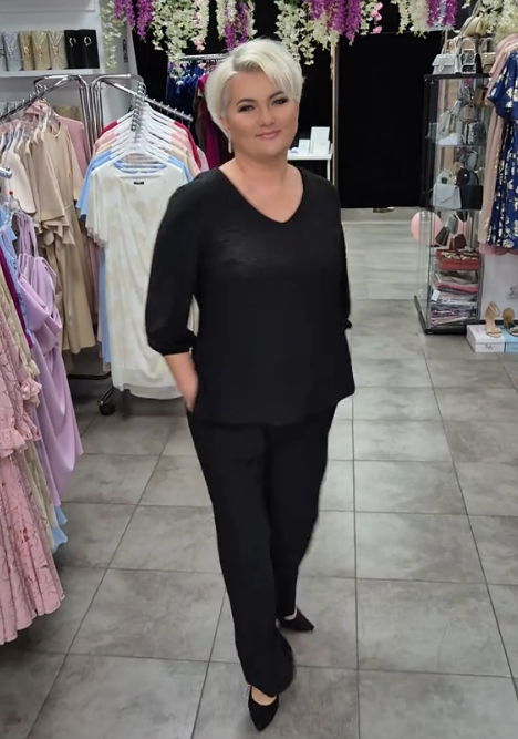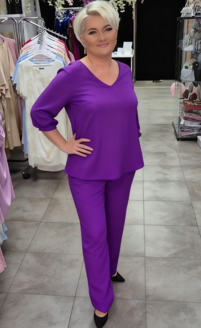 Prosty, a zarazem elegancki garnitur składający się z koszuli z okrągłym dekoltem i spodni.