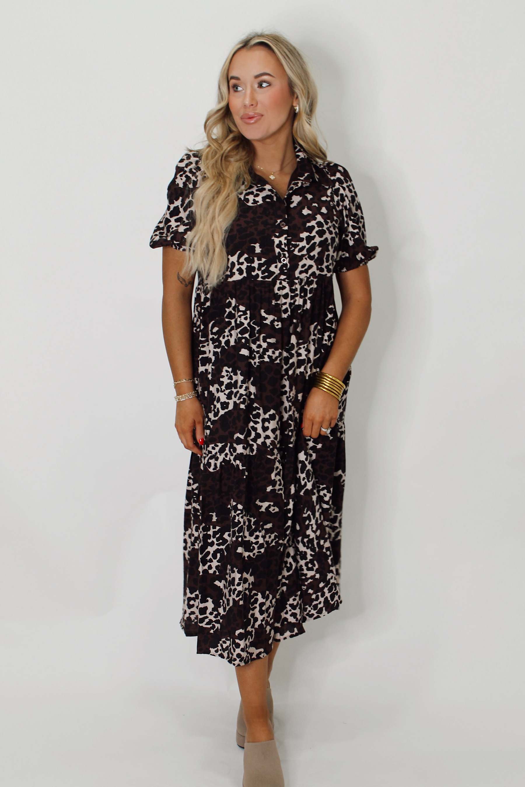 Unleash your wild side with our Coffee & Chat Midi Dress. This playful dress in brown and black leopard print is sure to turn heads. With front button detail and a flattering midi length, this dress is both stylish and comfortable. Perfect for a coffee date or a casual chat with friends. Meow!