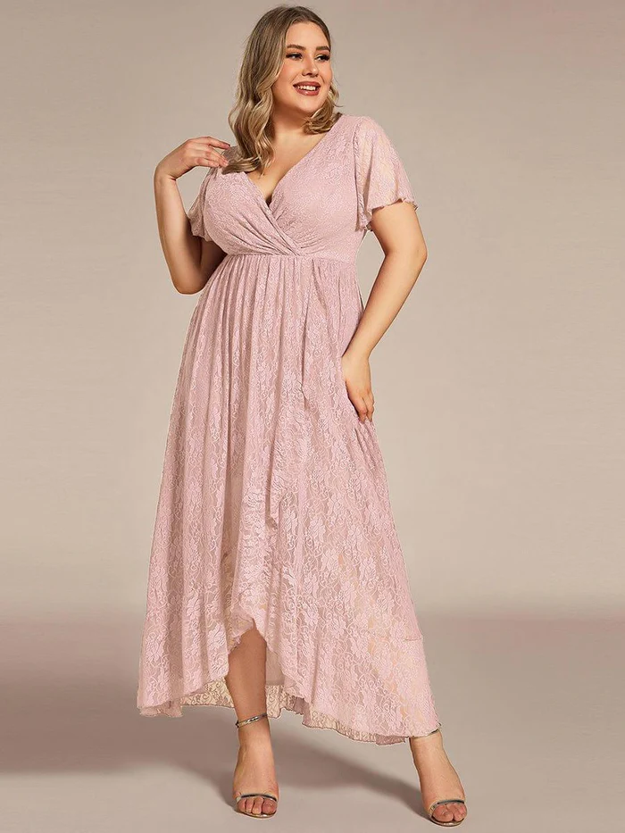 Wyróżnij się, zakładając tę koronkową, prostą wieczorową sukienkę w dużym rozmiarze. Krótkie, prześwitujące koronkowe rękawy i dekolt w serek ustępują miejsca ściągniętej talii i sylwetce w kształcie litery A sięgającej do ziemi. Wykończ swój wygląd obcasami, płaskimi butami i biżuterią. Falbana z przodu dodaje luksusowy detal z inspiracją vintage.