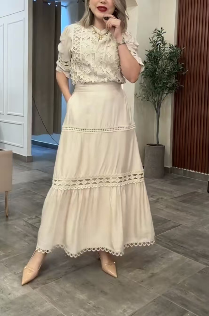 To ubranie damskie to doskonały wybór dla każdej kobiety, która ceni unikalny design i wysoką jakość wykonania. Składa się z precyzyjnie haftowanej bluzki oraz eleganckiej suknicy, na których widać staranność i uwagę do szczegółów. Materiały są miłe w dotyku, zapewniając komfort noszenia przez cały dzień. Dzięki swojej klasycznej i jednocześnie oryginalnej postaci, idealnie sprawdzi się zarówno na codzienne spotkania, jak i na wyjątkowe okazje. Całość charakteryzuje się ciepłym, przyjemnym wyglądem, który podkreśla kobiecą elegancję.