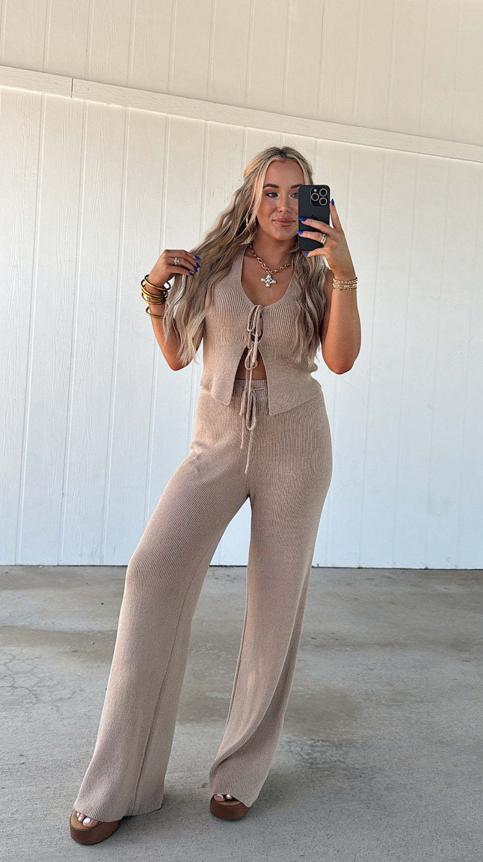 Get ready for a day of fun in the sun with our Knit Vest & Pant Set! This matching mocha-colored top and tie waist pants are made from a comfy knit material, perfect for a casual and cute beach day look. Don't forget to snap a pic for the 'gram!