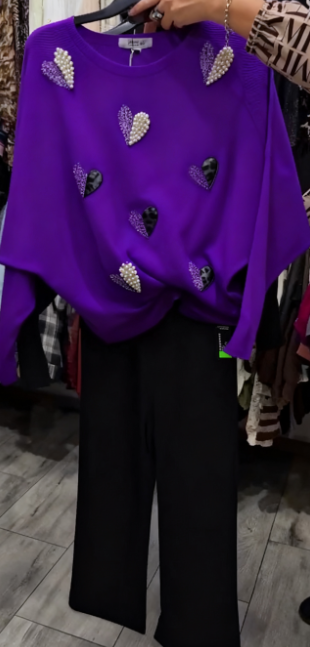 Marynarka ozdobiona wzorem w serca, zestawiona z czarnymi spodniami.