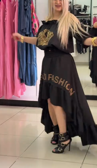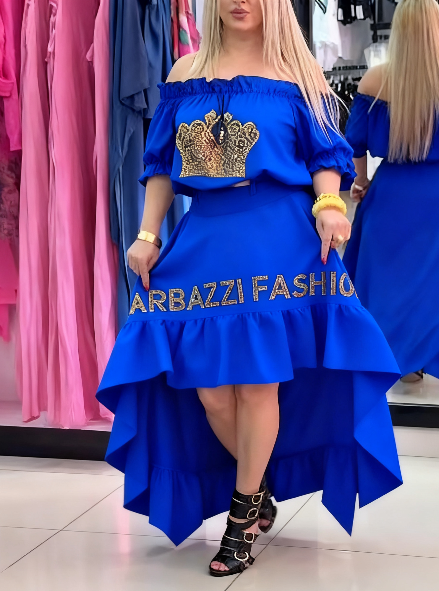 Ta wyjątkowa sukienka to idealny wybór dla każdej kobiety, która pragnie wyglądać wyjątkowo i modnie. Sukienka ma styl off - shoulder, co umożliwia wyświetlenie delikatnych ramion i daje jej notes sezualności. Na górnej części sukienki znajduje się zaskakujący dekór w formie królowej korony, który dodaje jej uroku i luksusu.