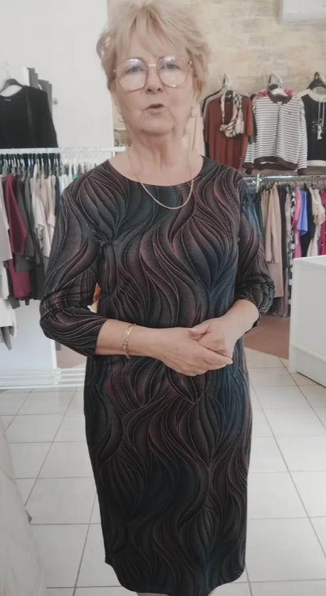 Damska sukienka z dynamicznymi, falistymi wzorami emanuje subtelną, nowoczesną elegancją. Intensywne, rozchodzące