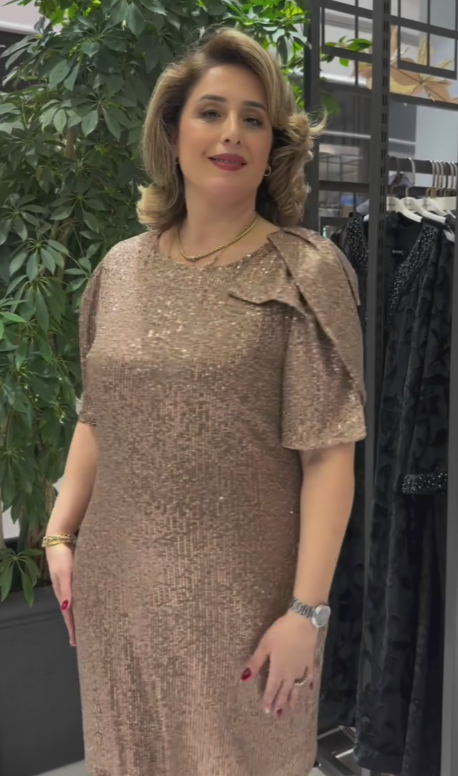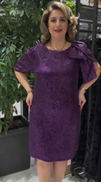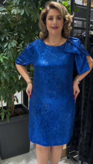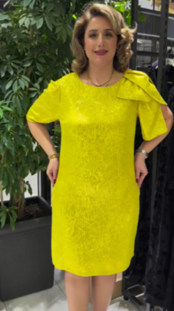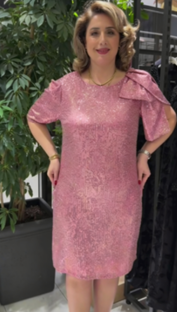 Sukienka z krótkim rękawem, ozdobiona cekinami, kokardą i okrągłym dekoltem.