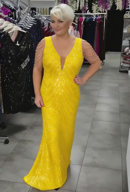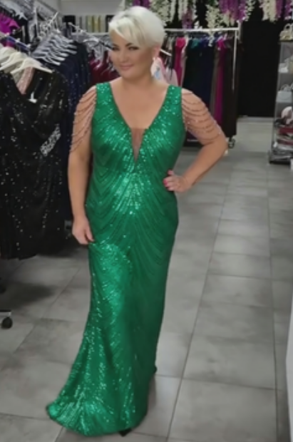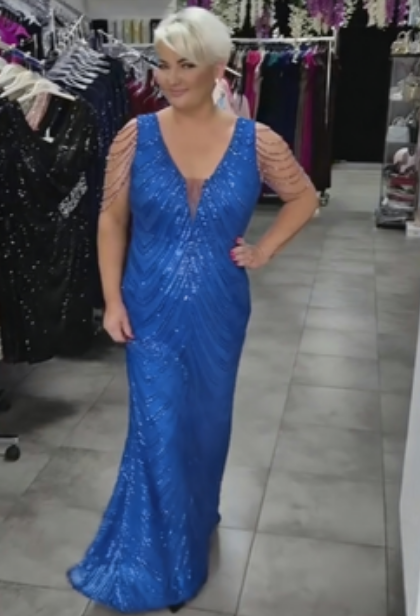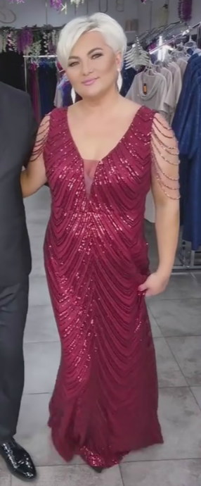 Damska sukienka ceremonialna wypełniona błyszczącymi elementami emanuje luksusem i eleganckim charakterem. Intensywne blasku podkreśla sylwetkę, a ozdobne łańcuchy na ramionach dodają subtelnego, aristokratycznego akcentu – idealna na wesela, gala lub specjalne okazje wieczorne.
