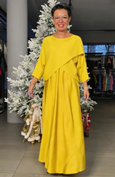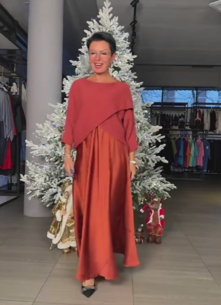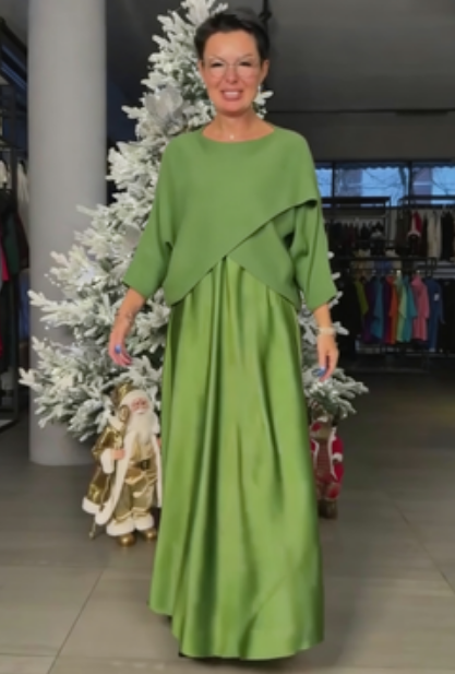 Sukienka z długim rękawem, okrągłym dekoltem i kopertowym dekoltem na piersi.
