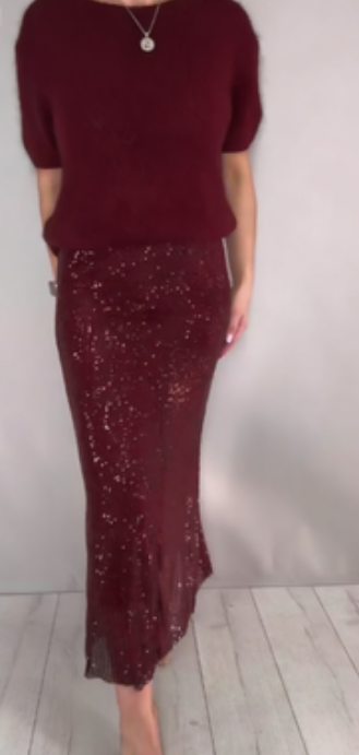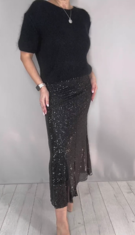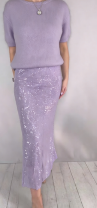 Dwuczęściowy strój damski, składający się ze swetra i zwiewnej spódnicy ozdobionej cekinami.