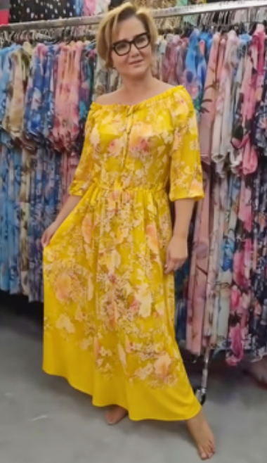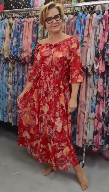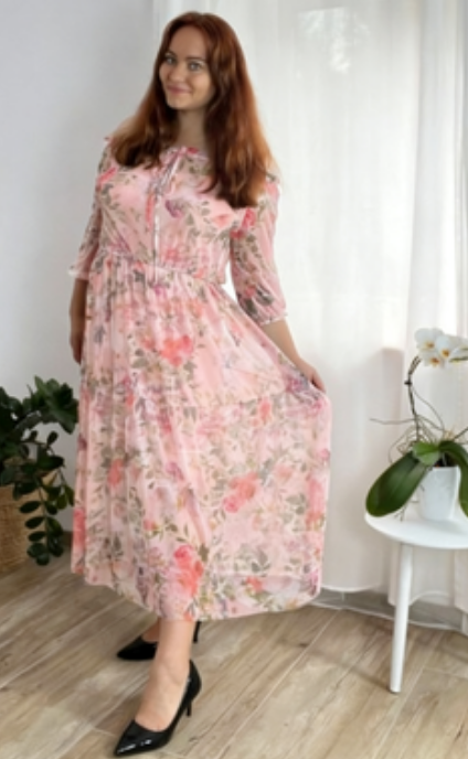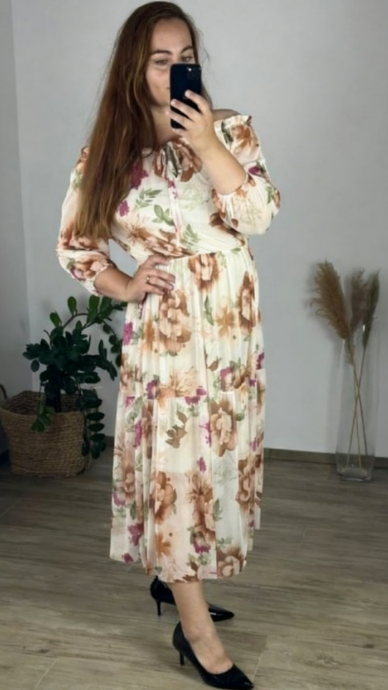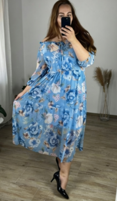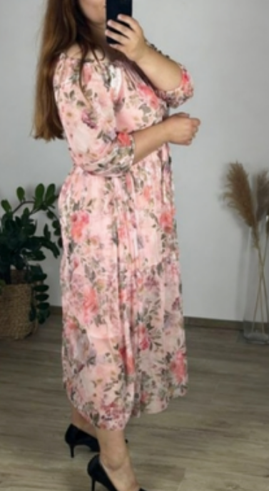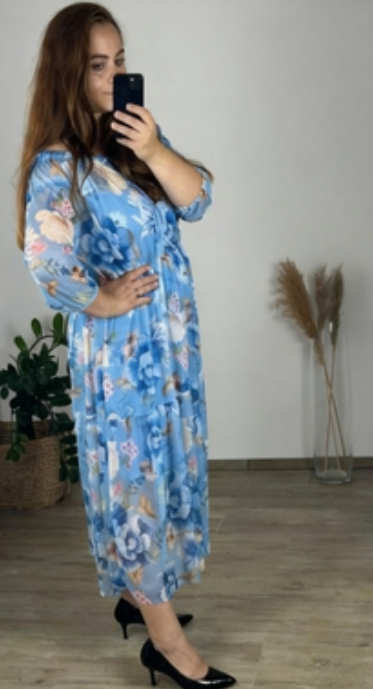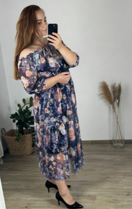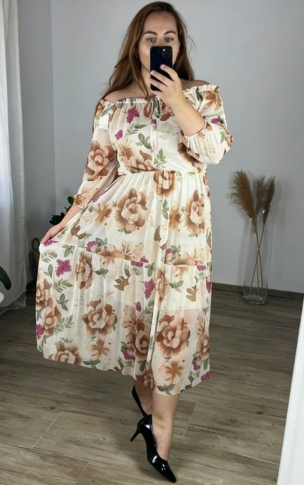Sukienka Floral Breeze z off-shoulder krojem i kwiatowym wzorem, wykonana z lightowego, przepuszczalnego materiału, oferuje świeżość, swobodę i kobiecy styl – dzięki czemu jest idealnym wyborem do letnich spacerów, spotkań z przyjaciółmi lub luźnych obiadów.