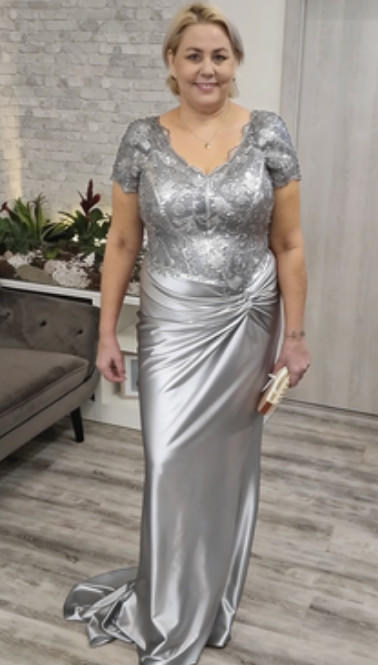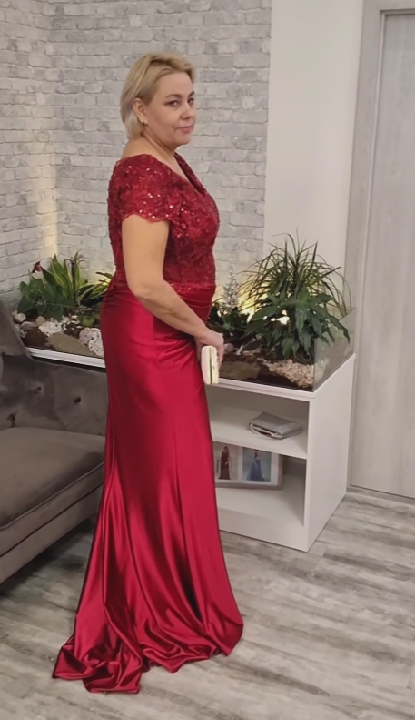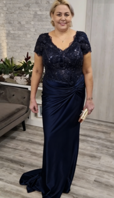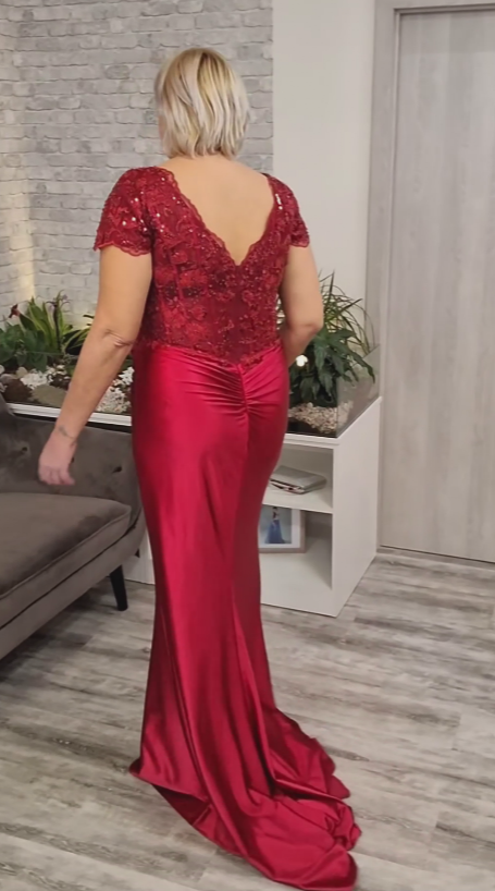 Sukienka z krótkim rękawem, ozdobiona koronką i cekinami na klatce piersiowej.