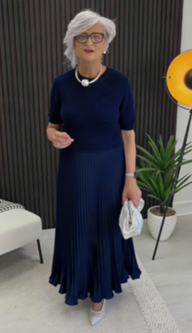 Elegancka sukienka maxi niebieska z sweterkiem i plisami: stylowa propozycja na codzienne wyjścia oraz spotkania towarzyskie