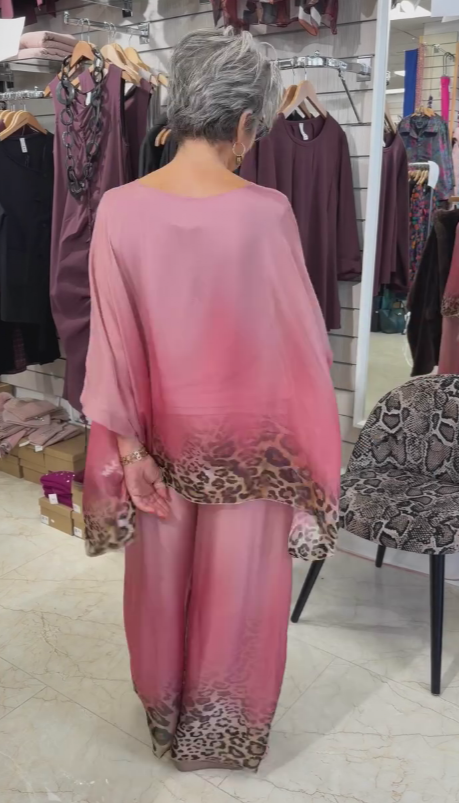 Komplet z luźnym topem i szerokimi nogawkami, z nadrukiem w panterkę i okrągłym dekoltem