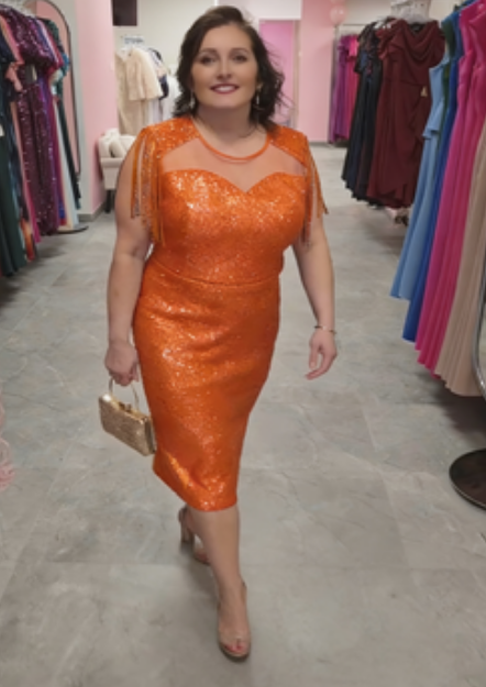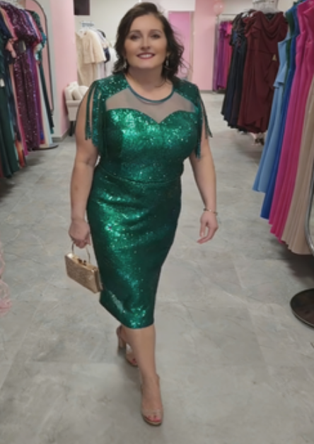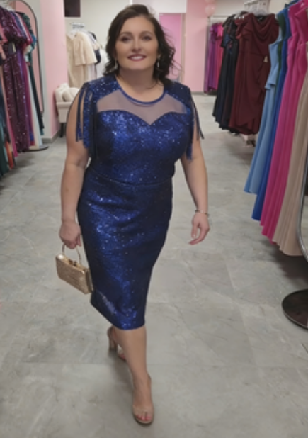 Sukienka ta – Niebieska sukienka midi z błyszczącymi cekinami i frędzlami, która oozuje elegancję i blask!