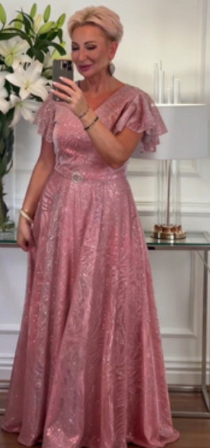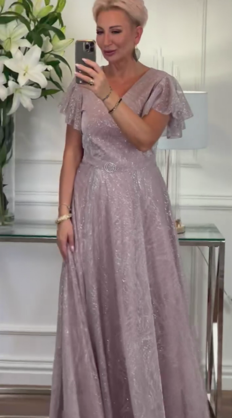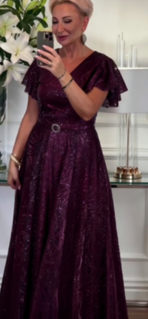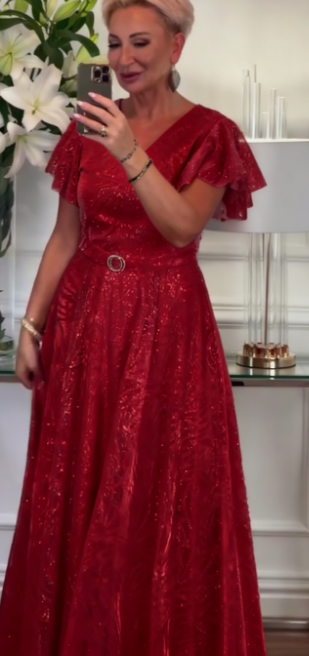 Sukienka z krótkim rękawem, falbanką i dekoltem w serek, wykonana z połyskującego materiału.