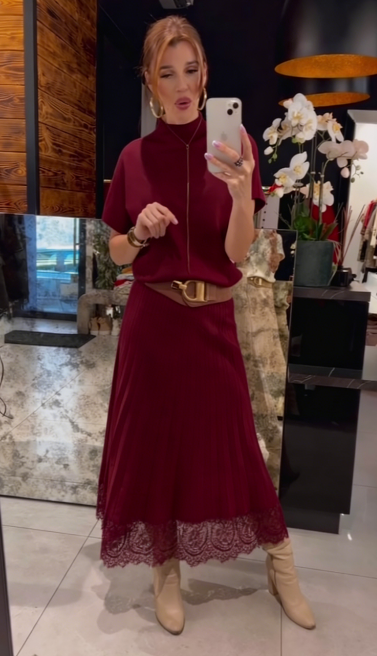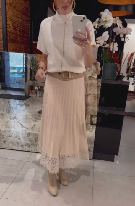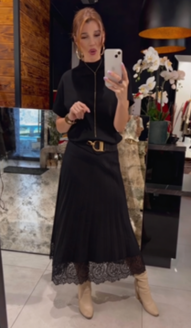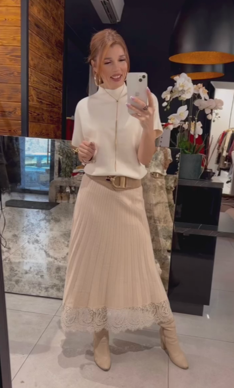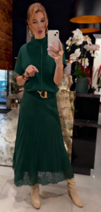 Przedstawiamy wyrafinowaną sukienkę midi – połączenie delikatnego beżowego koloru, wysokiego dekoltu z zamkiem błyskowym, plisowanej spódnicy z koronkowym wykończeniem oraz ozdobnego paska w talii, idealna dla kobiet, które cenią wyrazisty styl i komfort na imprezach wieczornych lub spotkaniach biznesowych. Ta sukienka to więcej niż tylko odzież: to symbol pewności siebie i wyrafinowania, która sprawi, że czujesz się jak gwiazda. Wykonana z miękkiego, elastycznego materiału, łączy funkcjonalność z artystycznym designem. Beżowy kolor dodaje elegancji, a plisy oraz koronka nadają stylizacji wyrazisty i kobiecy charakter – idealna na różnorodne okazje formalne.