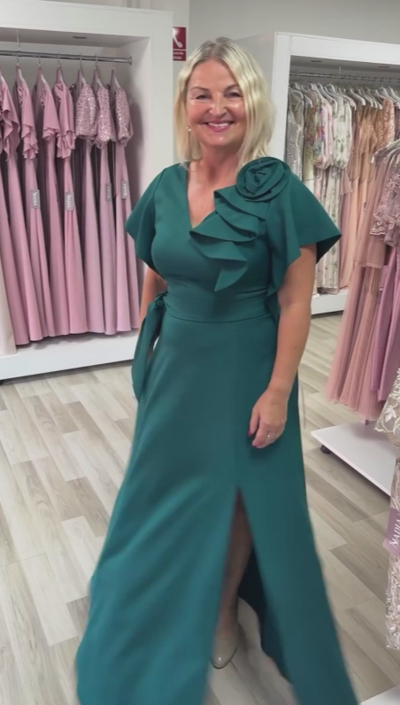 Sukienka ma dekolt w serek i rozcięcie, ozdobiona jest falbankami i trójwymiarowymi kwiatami.