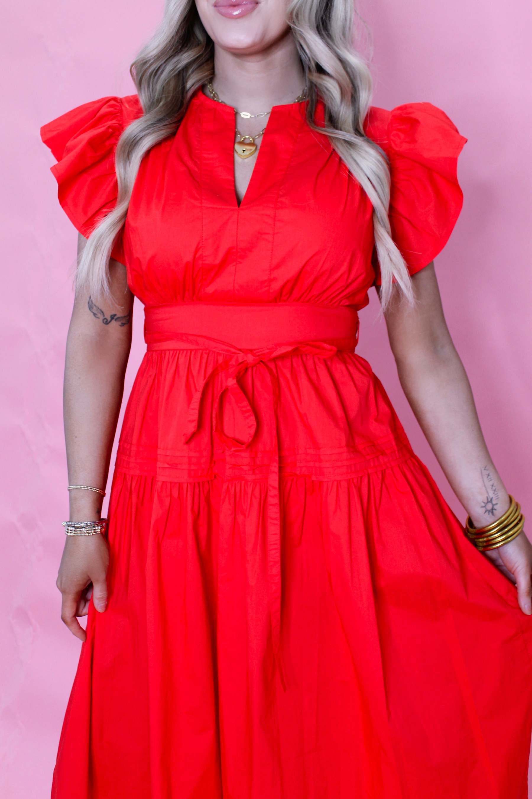 Get ready to sip on some red wine in style with our elegant and graceful midi dress. With its simple and timeless design, this red dress features short sleeves and a flattering v neckline. Perfect for any occasion, this dress will make you feel beautiful and confident. Cheers to that!