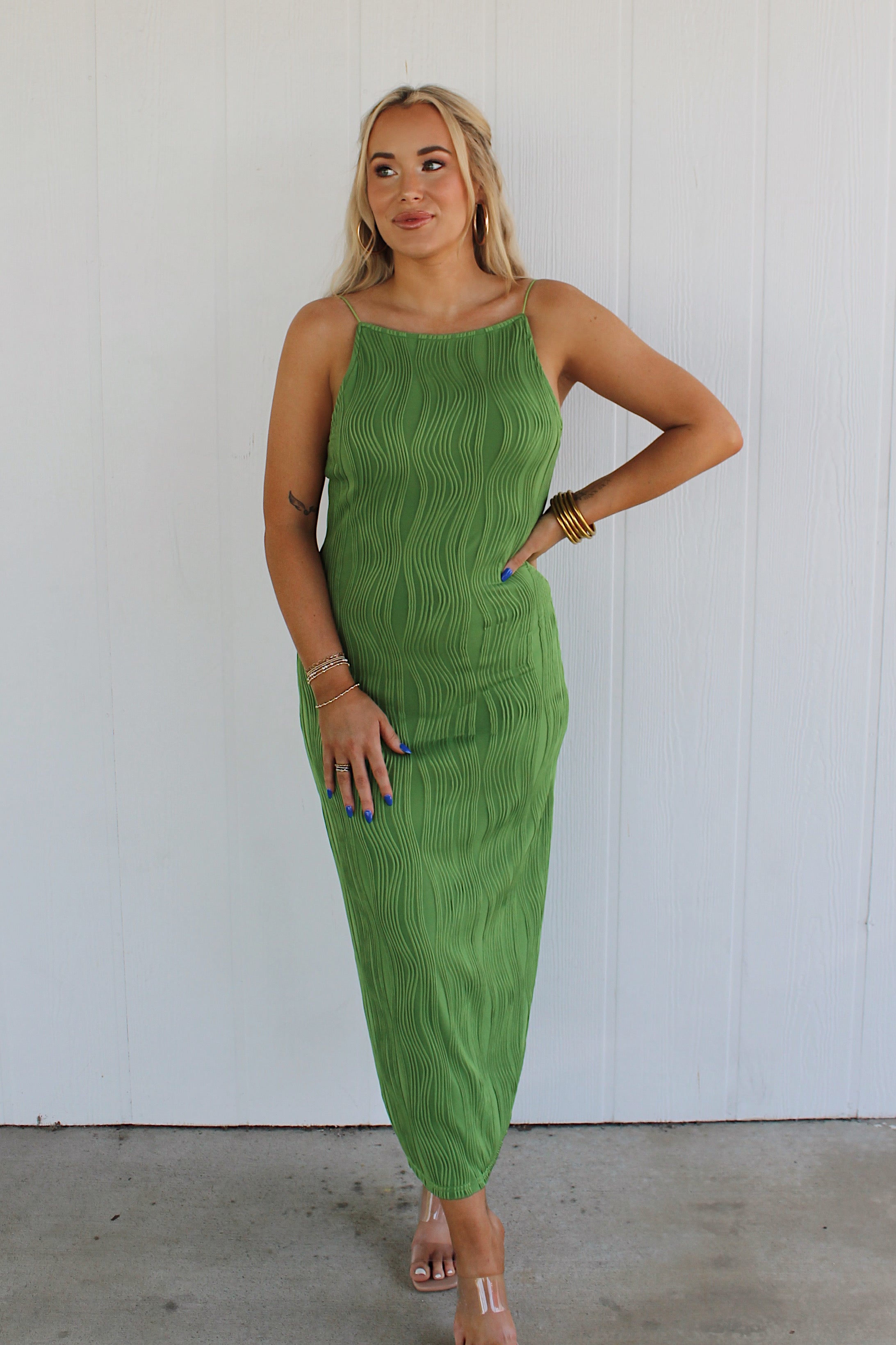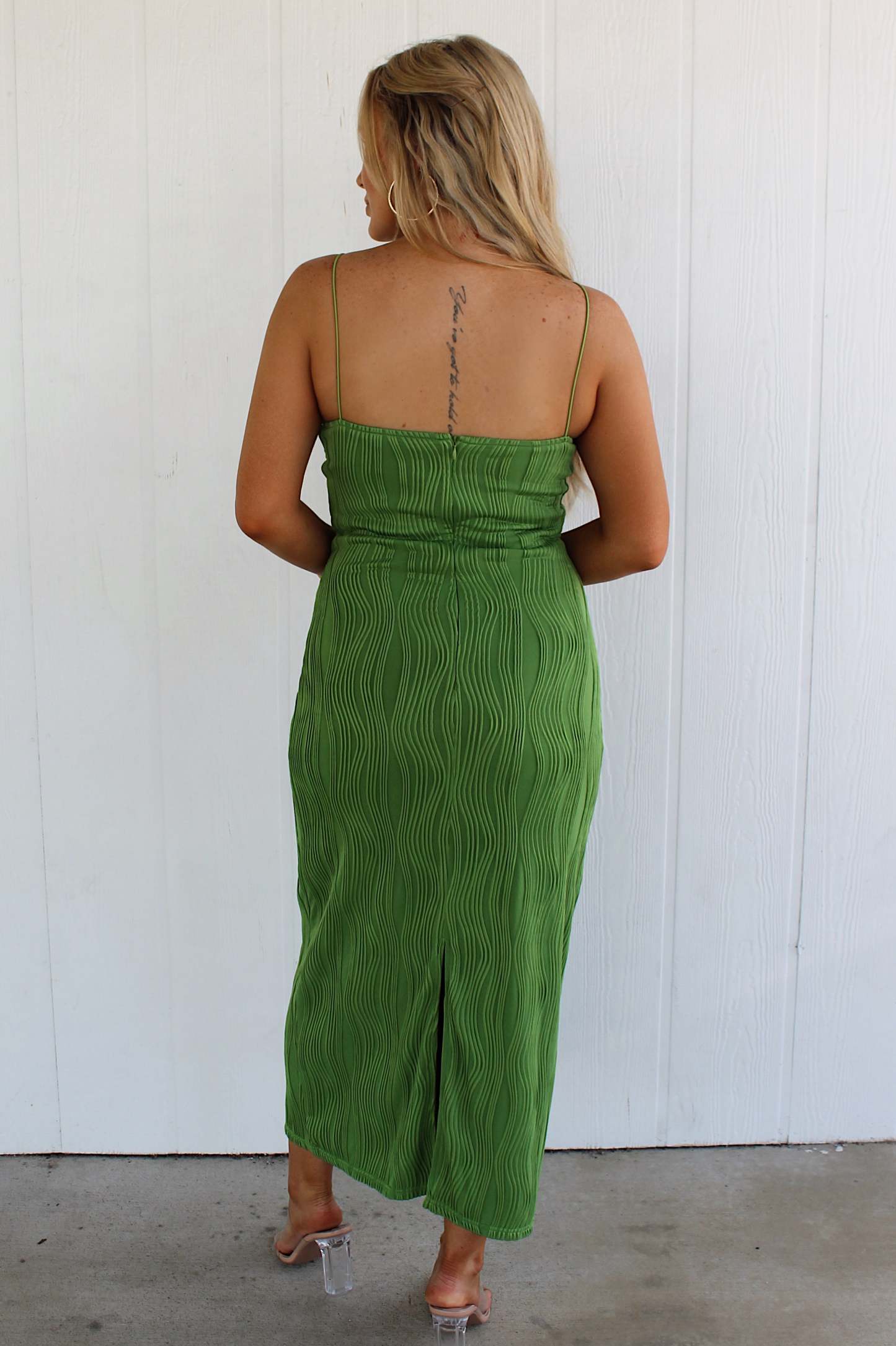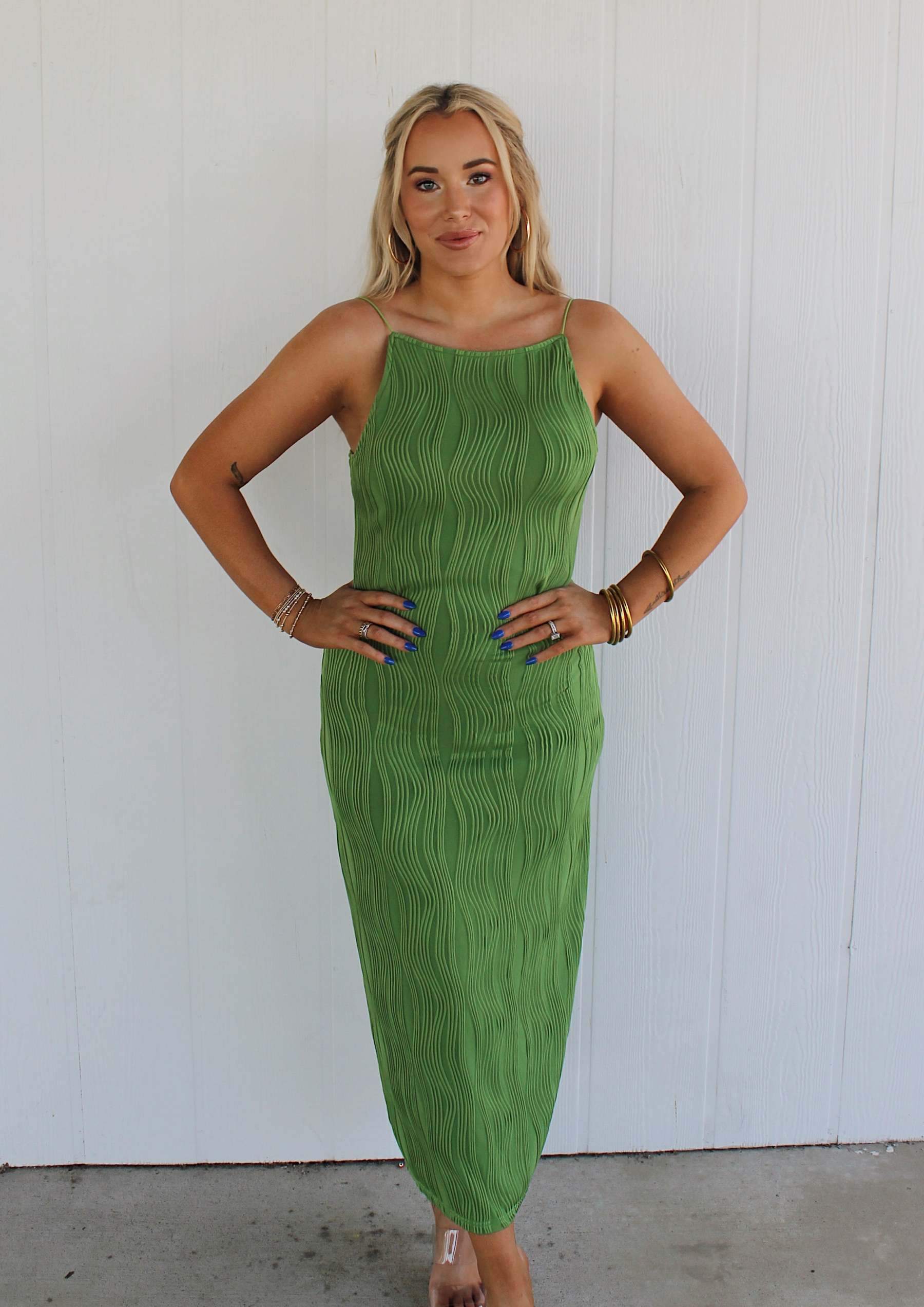 Get ready to turn heads in our Slim Midi Dress - Kiwi! This detailed, kiwi-colored dress boasts a flattering slim fit and high square neck, perfect for showing off your summer tan. With delicate spaghetti straps, it's the ideal dress for any vacation. So cute and stylish, you'll want to wear it everywhere.