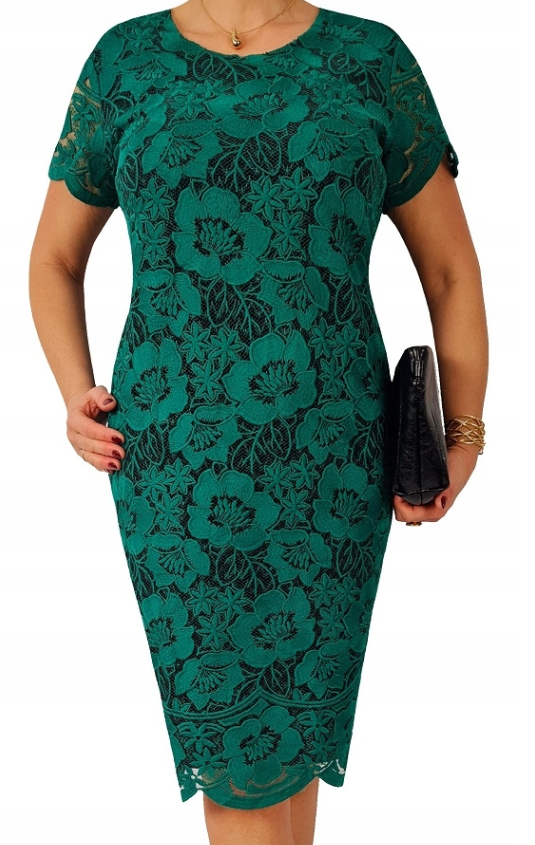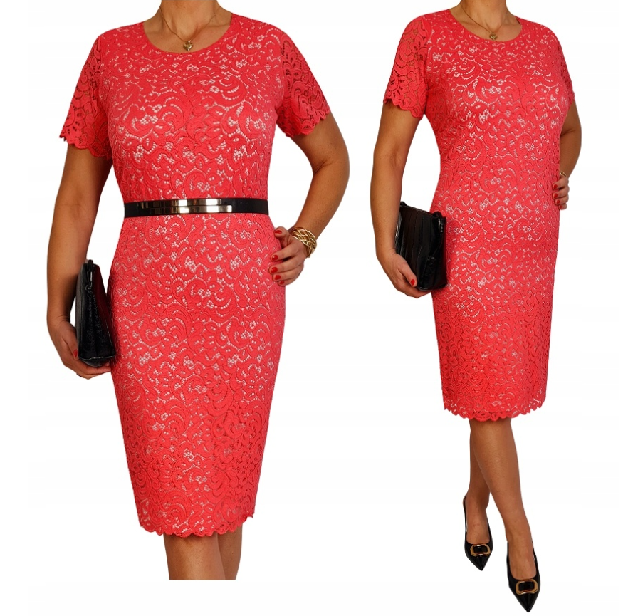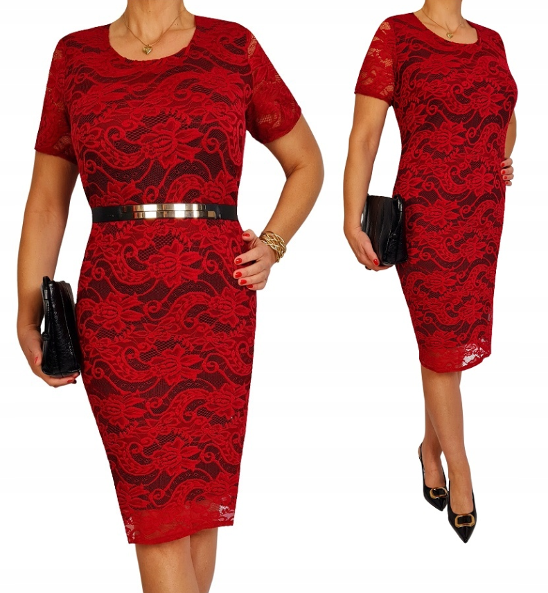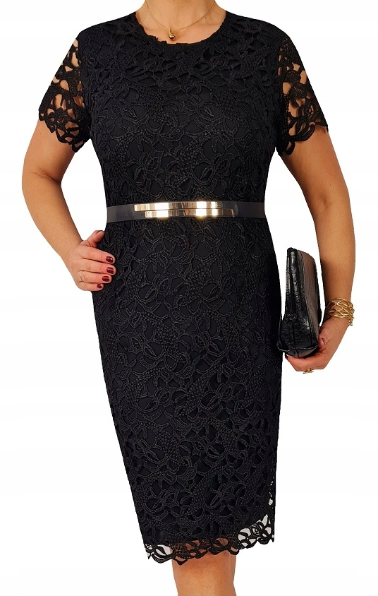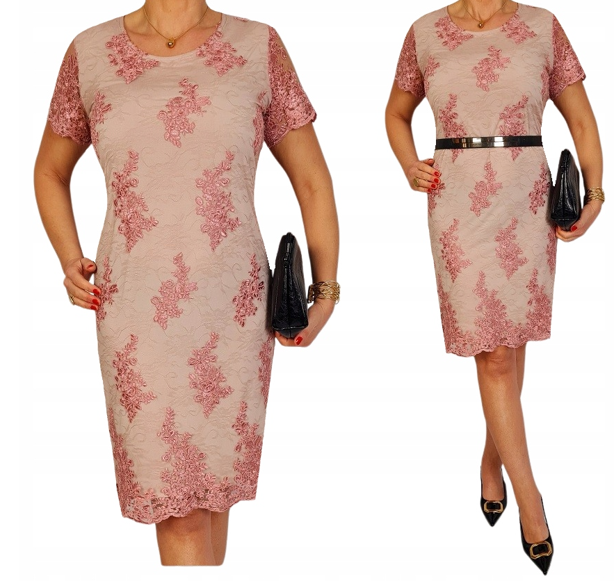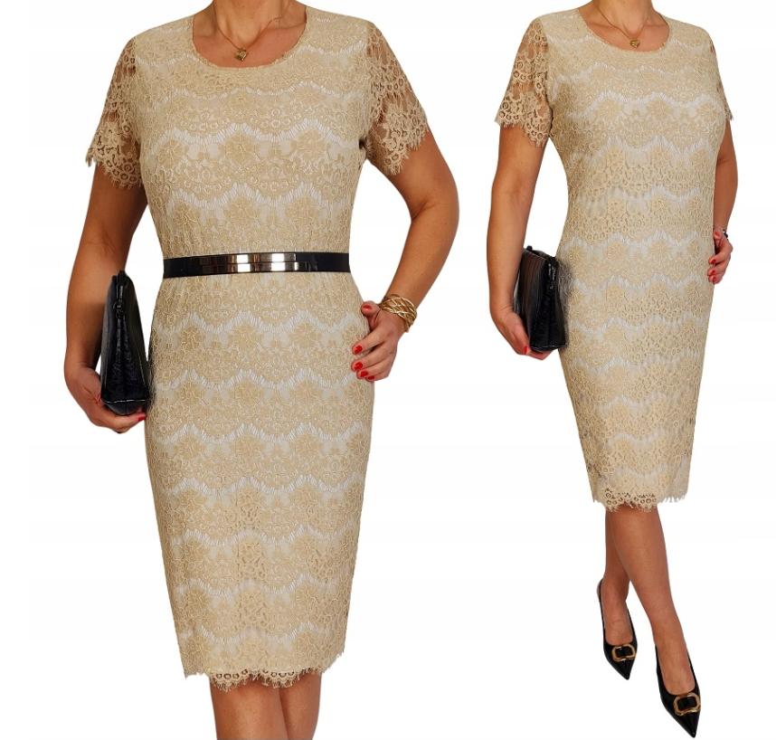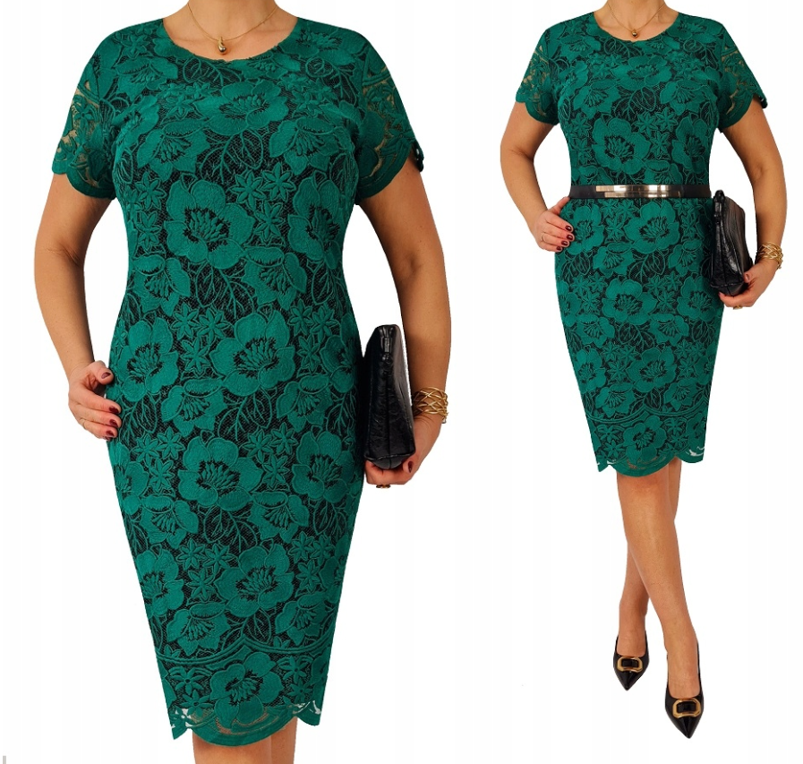 Ma okrągły dekolt i krótkie rękawy. Główna część spódnicy wykonana jest z koronki pokrytej delikatnymi kwiatowymi wzorami, co dodaje romantyzmu i elegancji. Talia jest wyposażona w czarny pasek z metalową ozdobną klamrą, która odgrywa rolę w kształtowaniu talii i podkreślaniu krzywizny ciała. Ogólny kształt to dopasowany krój, spódnica jest owinięta wokół bioder, a dół ma koronkowe detale. Styl jest dojrzały i intelektualny, odpowiedni na formalne lub półformalne okazje.