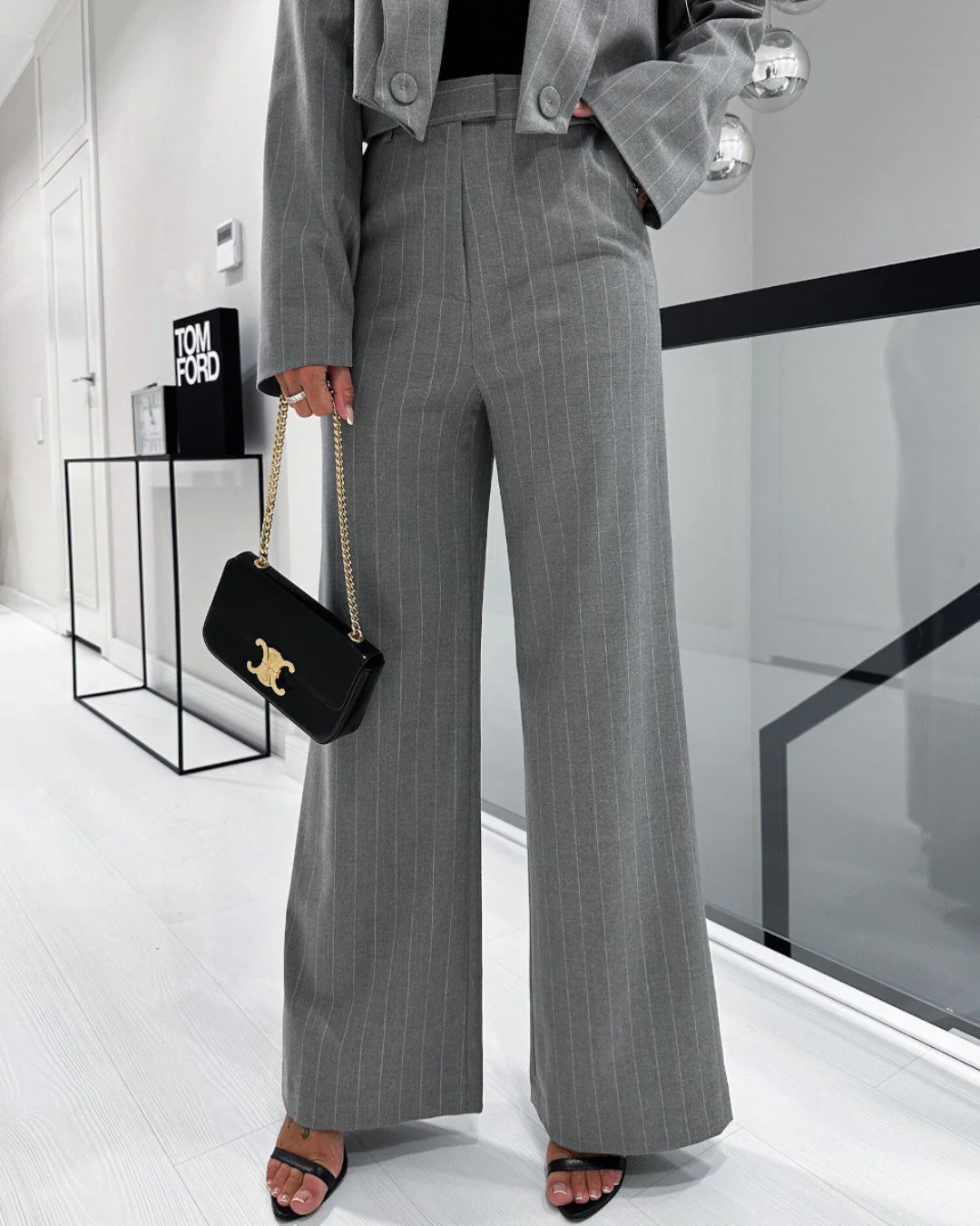 Ten szary, prążkowany komplet składający się z marynarki i spodni jest elegancko skrojony. Składa się z marynarki odzwierciedlającej najnowsze trendy mody oraz spodni z szerokimi nogawkami. Idealnie sprawdzi się zarówno na oficjalne okazje, jak i na co dzień.