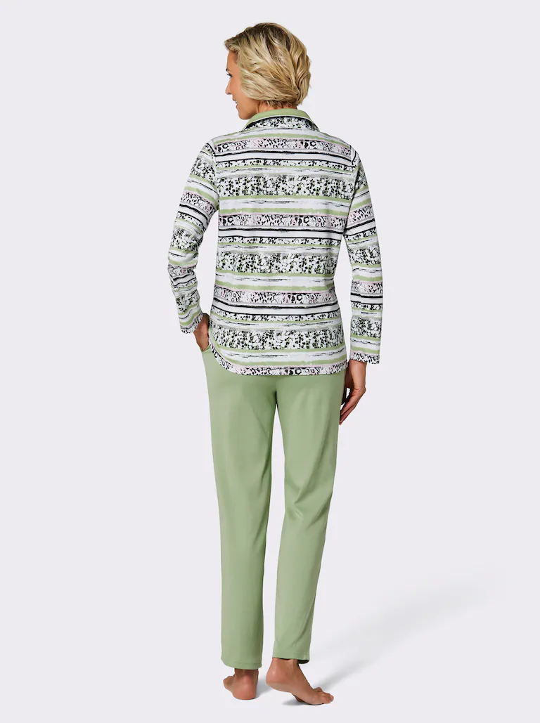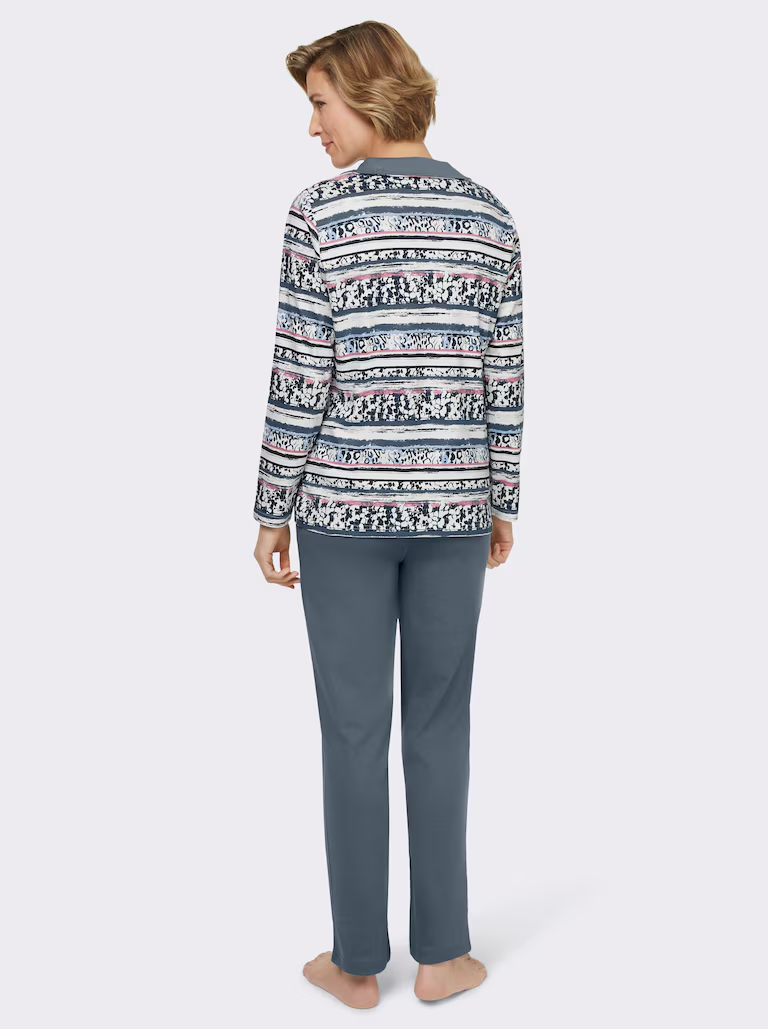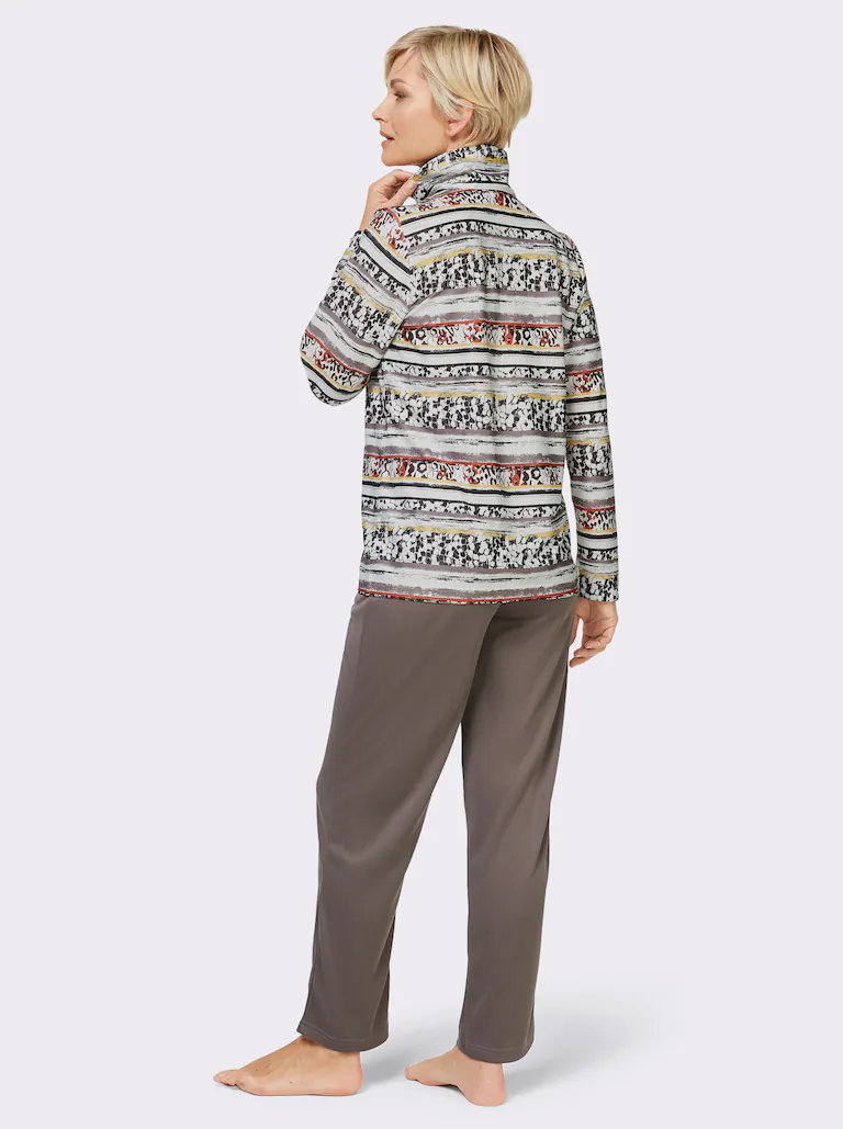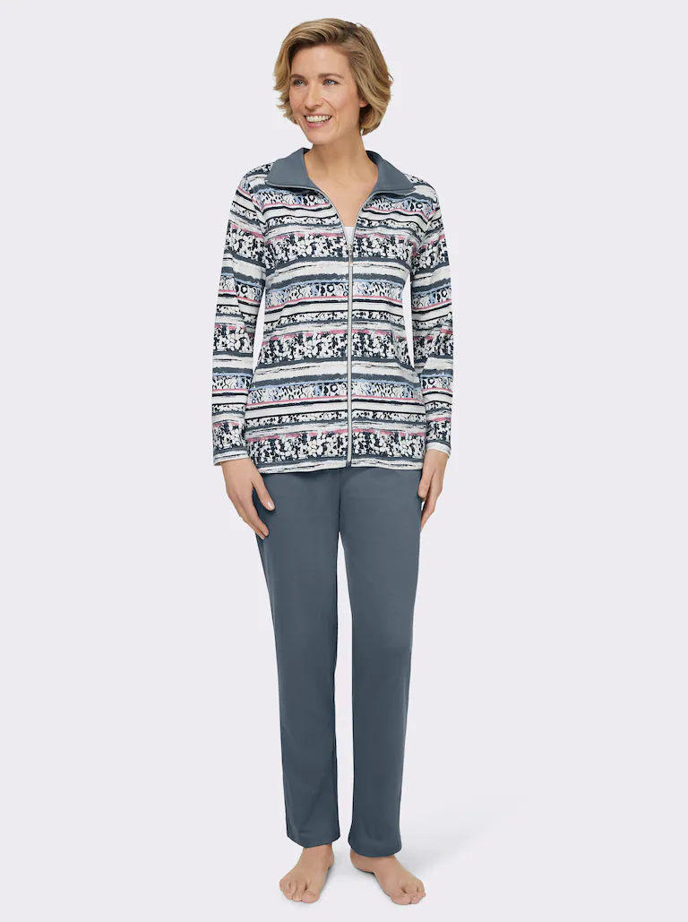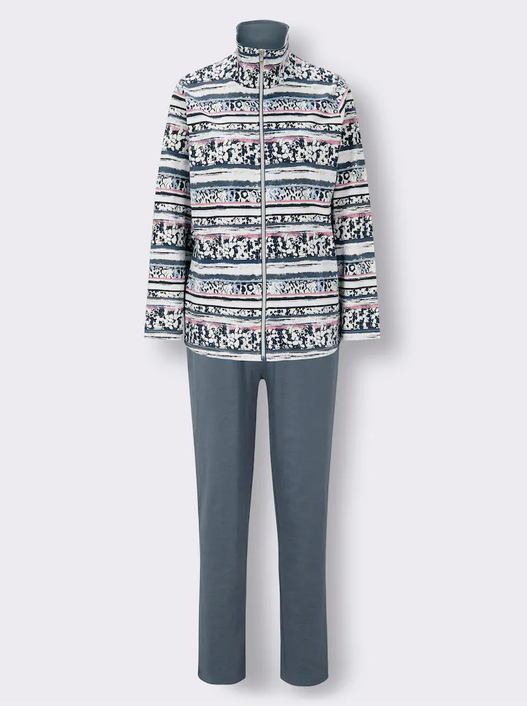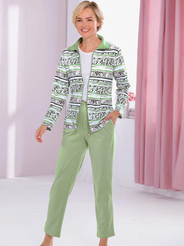 Zawsze komfortowy klimat dla ciała: wygodny strój wypoczynkowy z tkaniny interlock, która zachowuje kształt. Z kołnierzem wykładanym i zamkiem błyskawicznym na całej długości. Spodnie z elastycznym pasem w jednolitym kolorze i dwiema kieszeniami.