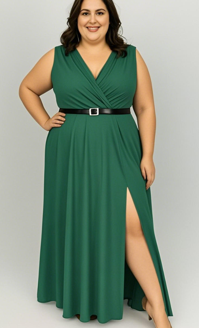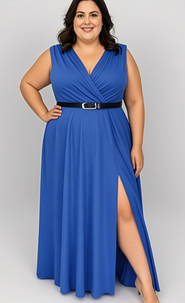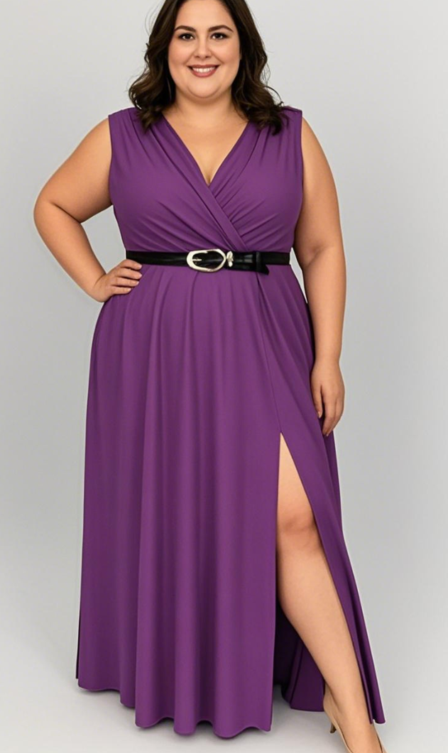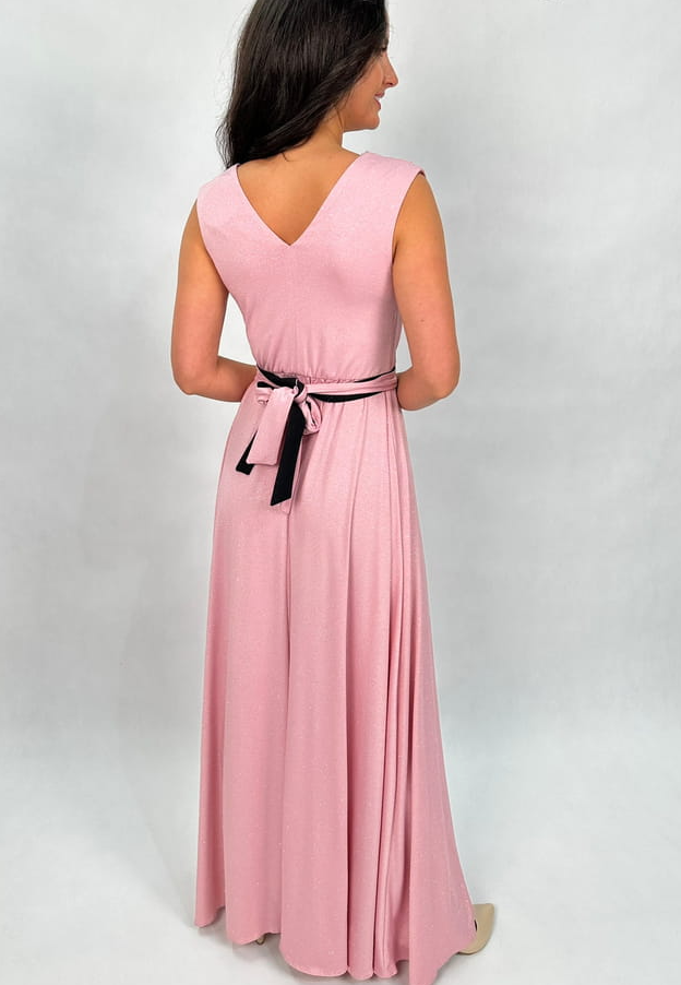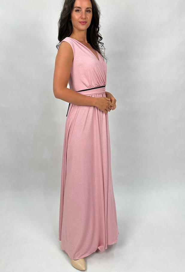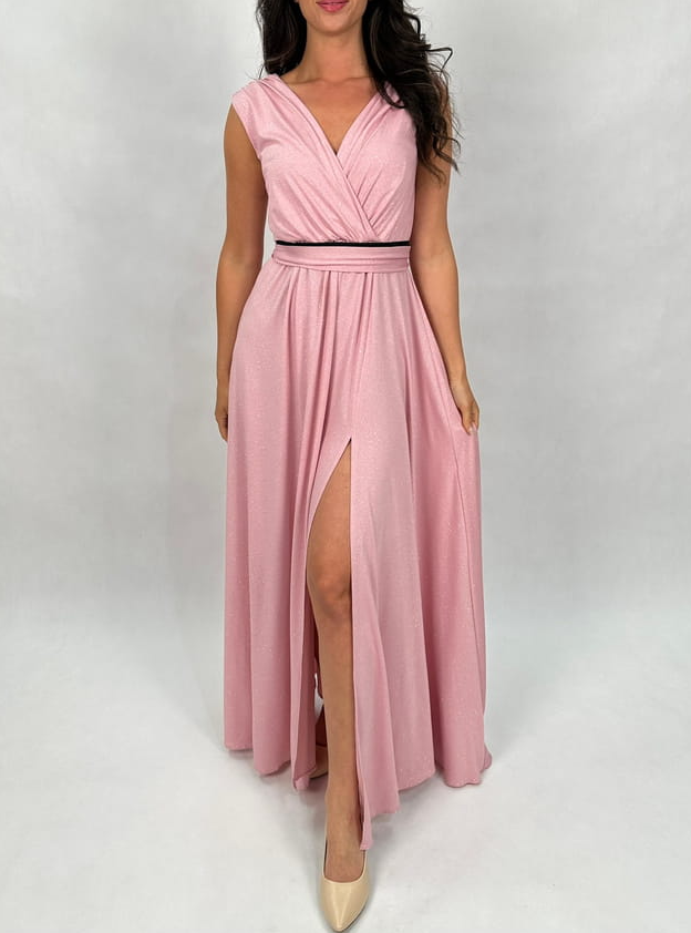 Długa rozkloszowana sukienka w kolorze różowym z drobinkami brokatu, uszyta z elastycznego materiału. Dekolt kopertowy, w pasie gumka. W komplecie dwa wiązane paski.