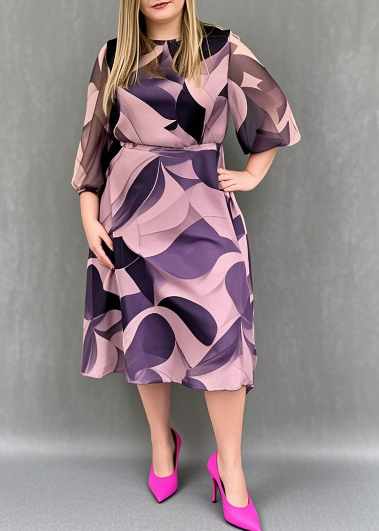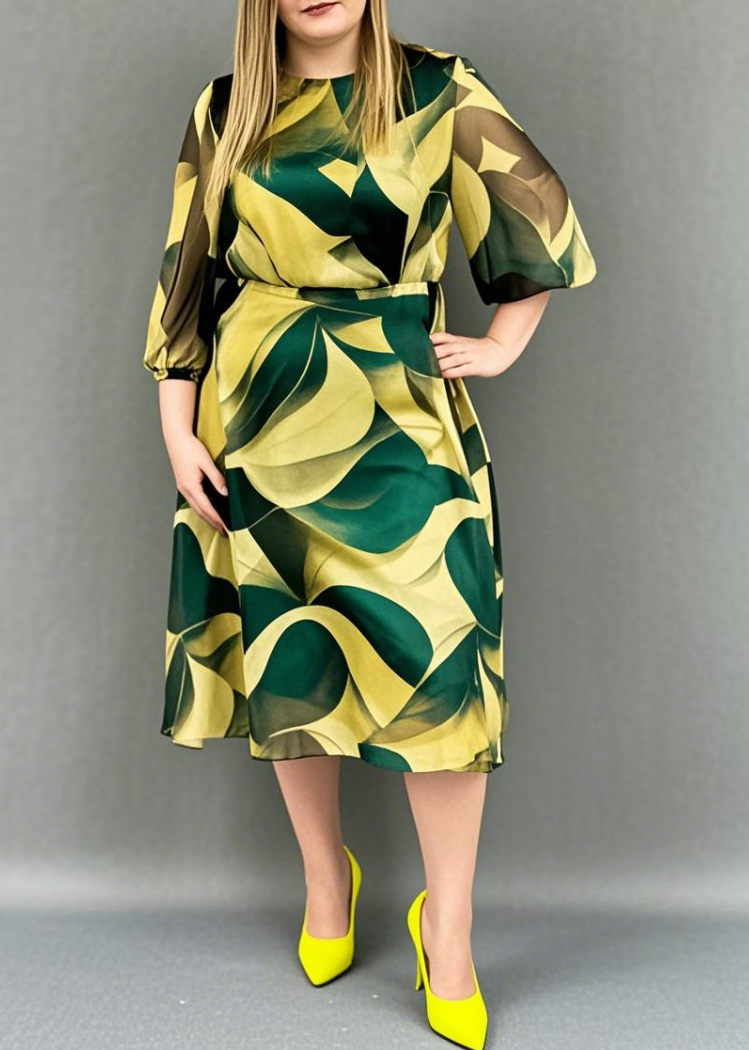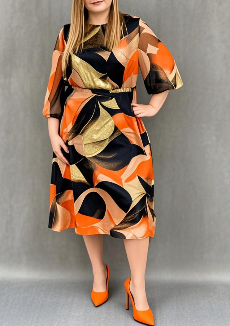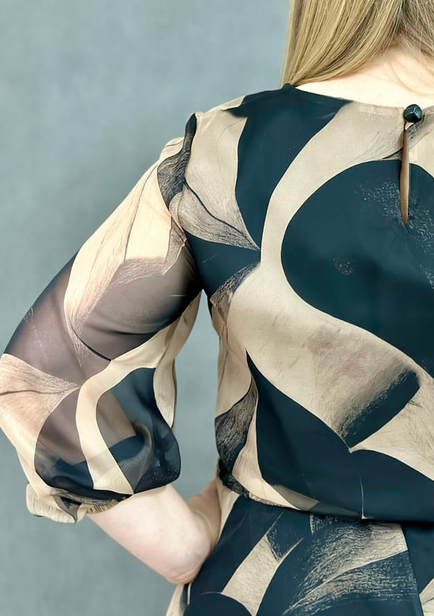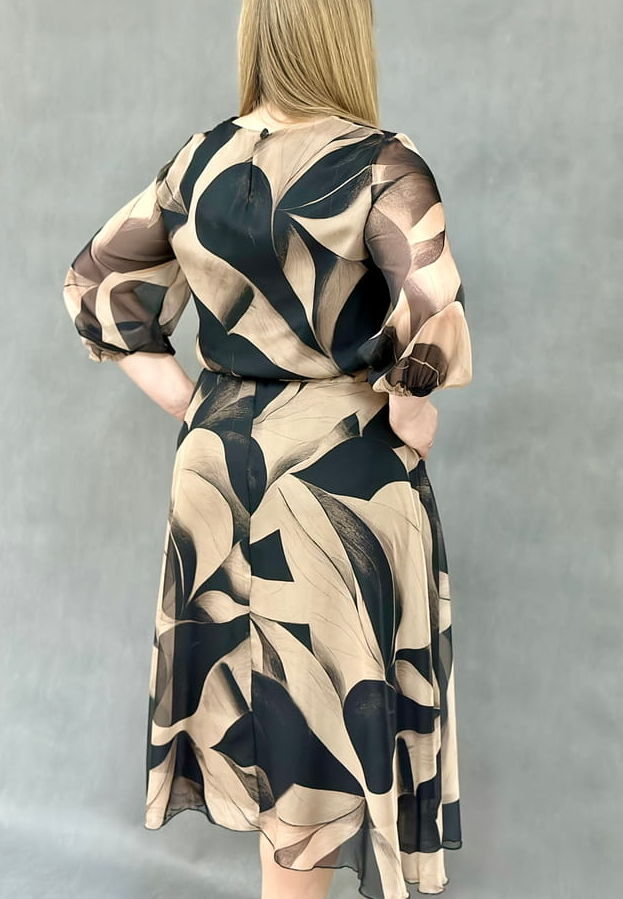 Sukienka midi w beżowe wzory na czarnym tle. Transparentne rękawy 3/4, w talii gumka i pasek.