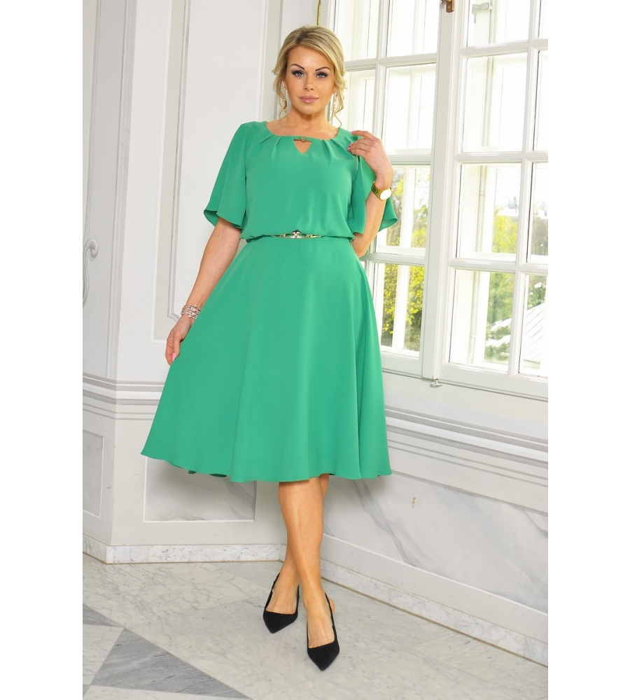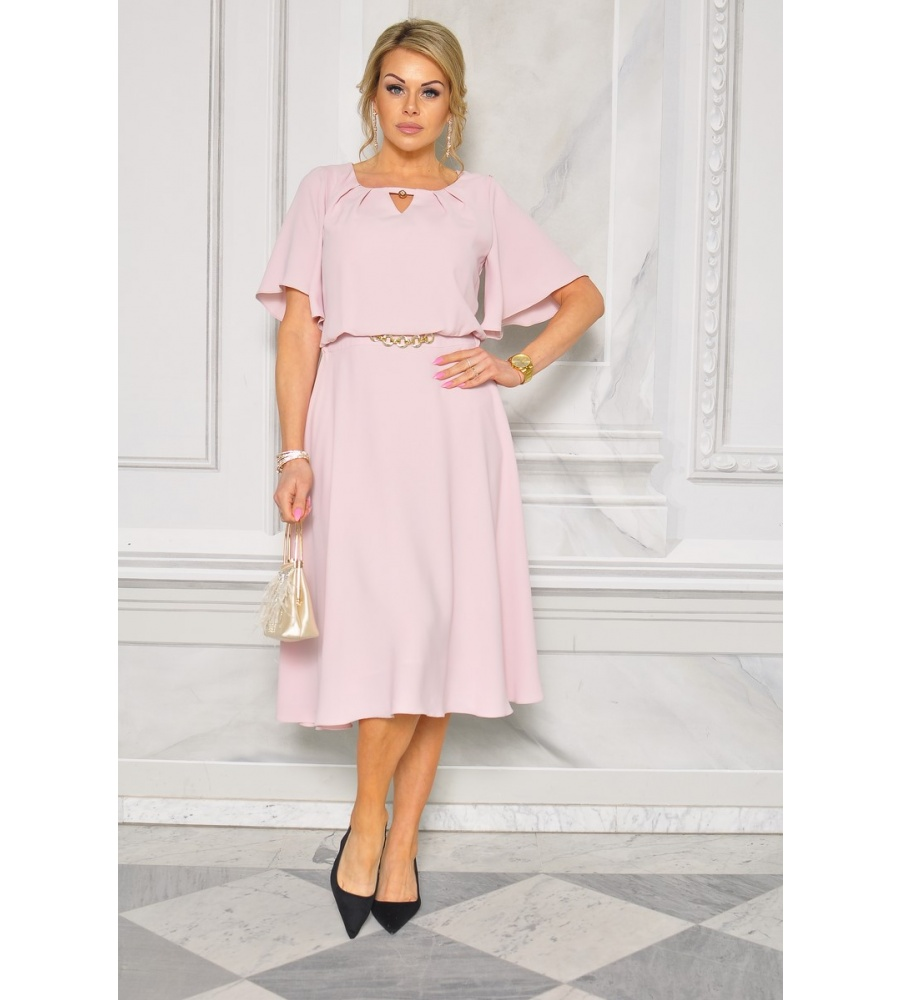 Tylko dzisiaj, 49% zniżki, kup teraz i zapłać gotówką przy odbiorze!Sukienka midi w kolorze pudrowego różu ze złotymi dodatkami i złotym łancuszku w talii. MODEL- TR-9539