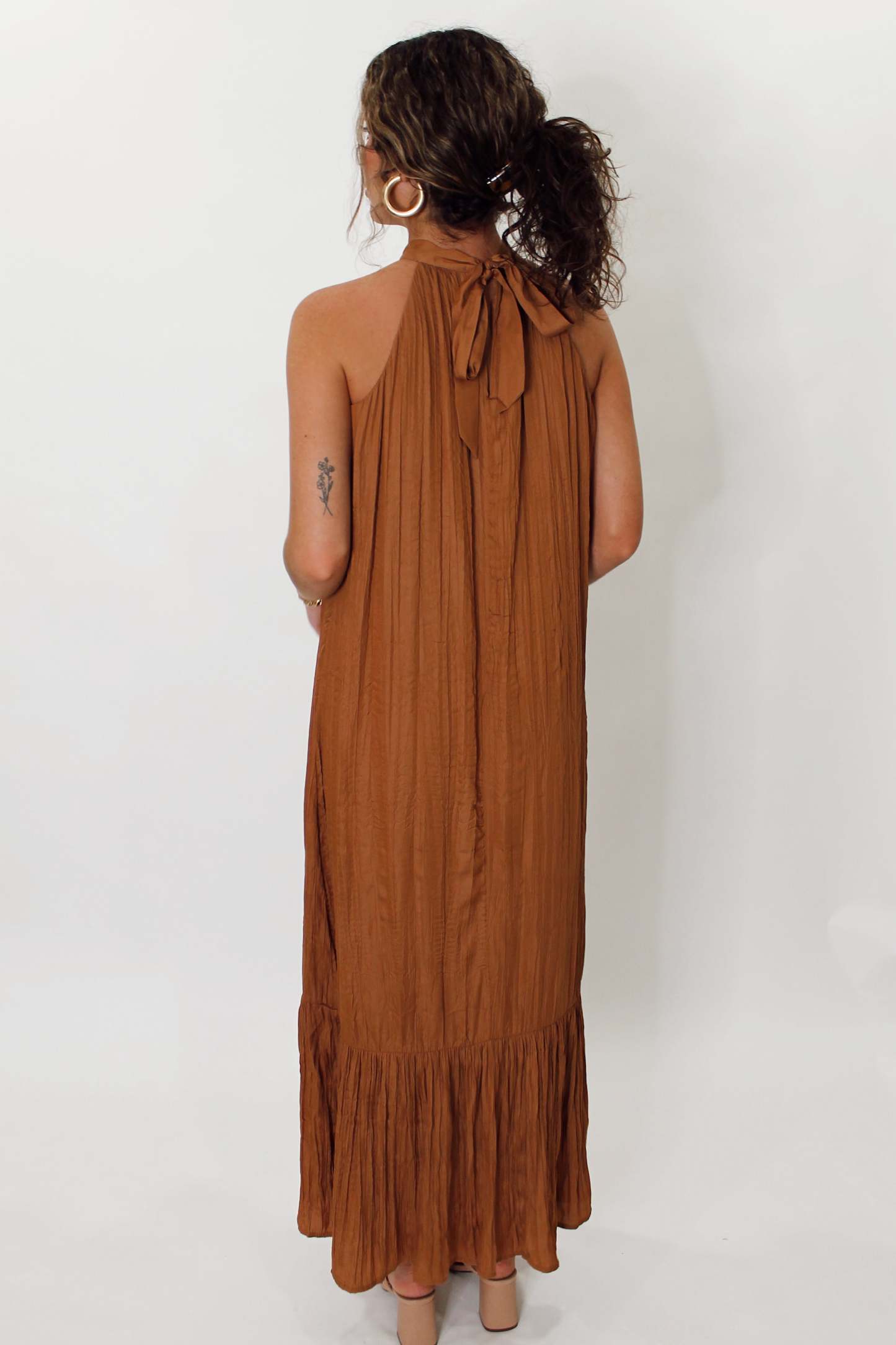 Unleash your winning attitude with this camel satin maxi dress. The halter neck adds a touch of elegance, perfect for any dressy occasion. Stay stylish and comfortable while turning heads.