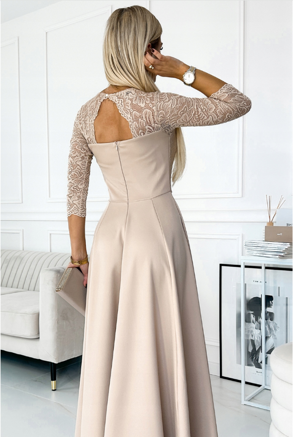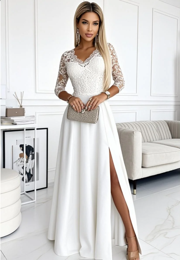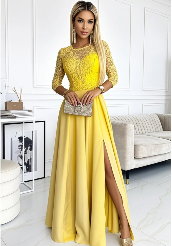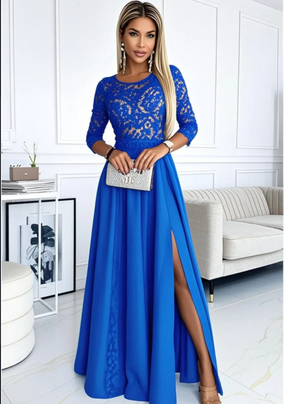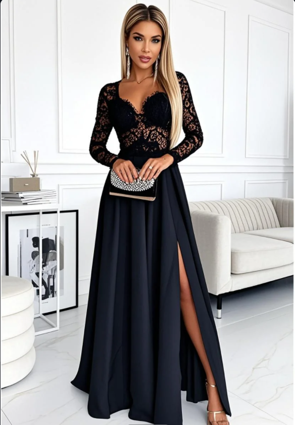 Dekolt w serek i koronkowe przeszycia na górnej części ciała są wykwintne i seksowne. Rękawy średniej długości dodają elegancji, a duża spódnica z rozcięciami sprawia, że wyglądasz elegancko i elegancko podczas chodzenia. Nadaje się na kolacje, imprezy i inne okazje, a także może łatwo stworzyć czarujący wygląd.